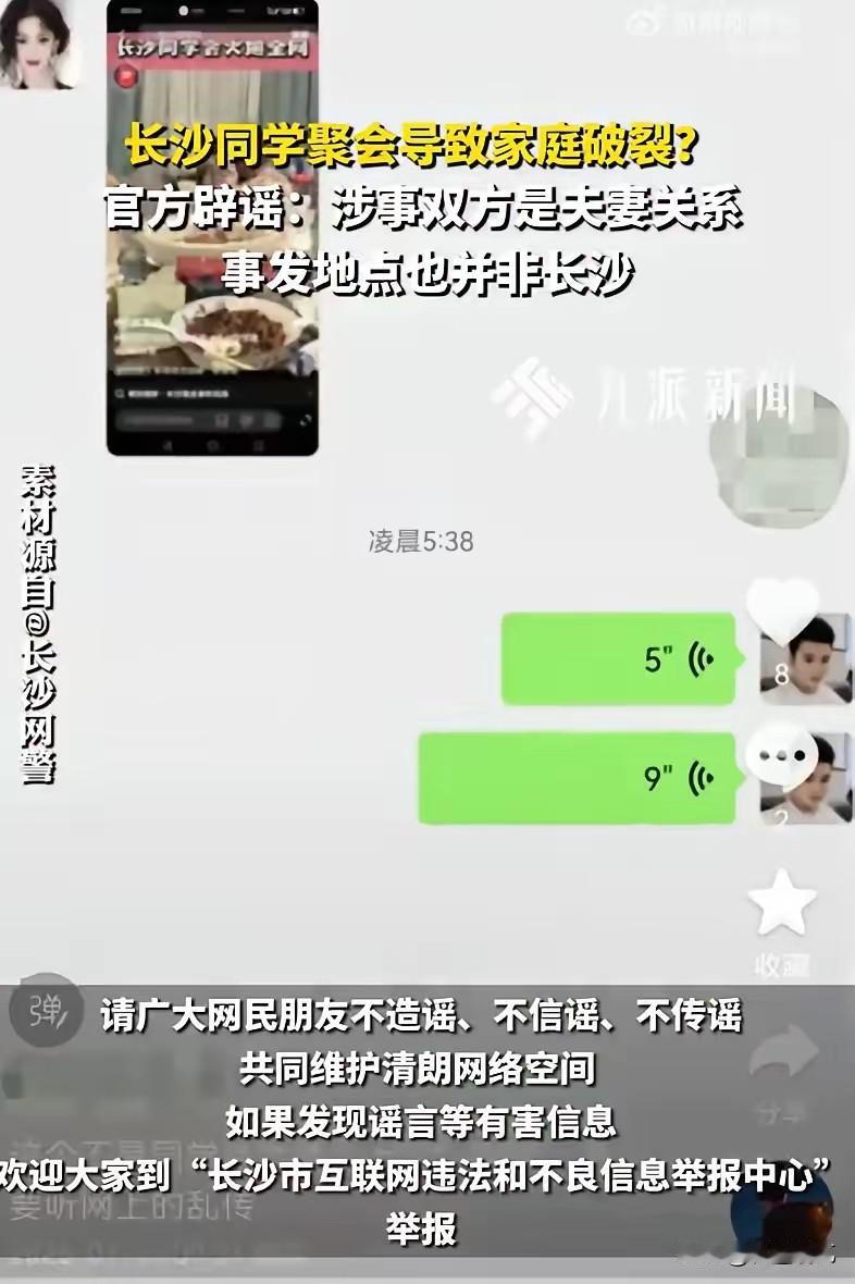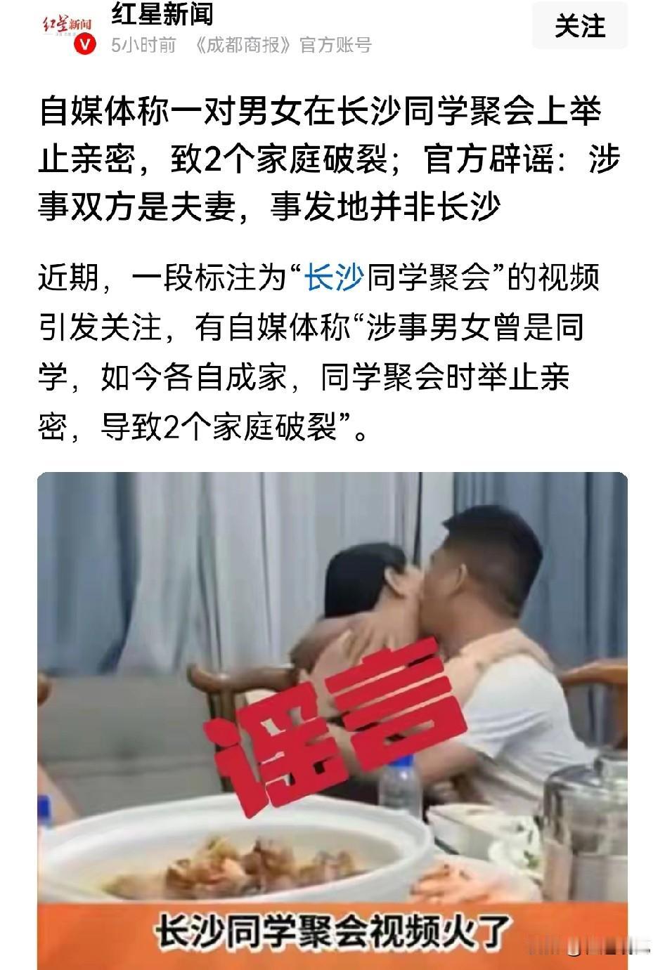 大家还记得长沙同学聚会的事吧,现在官方已经出来辟谣了, 视频中的男女原本就是夫妻,根本不存在因为同学之间在聚会上的亲密举止而导致家庭破裂的情况。 好家伙,这都啥时候了,事件的热度都已经过去了,很多人都一样把这事忘了,有关部门才想起来辟谣, 但是有网友指出,十年的夫妻能在参加同学会时还会有这样的举动,确实让人难以置信,不嫌弃对方就算不错了。还有夫妻双方有事直接面谈了,怎么还是在凌晨3点多发信息联系另一半啊。