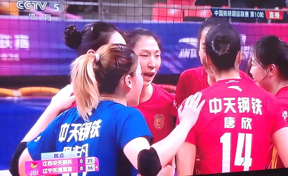 央视体育频道直播江苏女排对阵辽宁女排的比赛!没想到江苏女排的主场比赛信号这么好了!怪不得能够登上央视体育频道的电视直播呢! 江苏女排打辽宁女排,双方都是派上主力阵容上场比赛! 江苏女排全主力阵容上场比赛,主攻吴梦洁和唐欣,副攻杨佳万梓玥,二传张子萱,接应周页彤,自由人倪非凡。 辽宁女排派上一名外援扎特维奇,石冰彤,郑予茗,许嘉楠,郭慧珍等队员。美国外援阿奈没有上场比赛。 开局双方比分交替上升,中局过后江苏女排展现雄厚实力,江苏女排吴梦洁扣球得分,拦网得分,江苏女排开始比分领先。 辽宁女排进攻端受阻,不断被拦。辽宁女排的防守也没有江苏女排顽强。 局末阶段江苏女排20-13拉开比分差距。辽宁女排上一场比赛主场输给福建女排够,比赛气势不像刚刚换帅时候高涨。最后江苏女排25-16拿下第一局比赛。总比分江苏1-0辽宁。 江苏女排上一场比赛输给上海女排后,本场比赛要从辽宁女排找回比赛自信!辽宁女排想要爆冷取胜几乎不可能!天涯体育排球讯