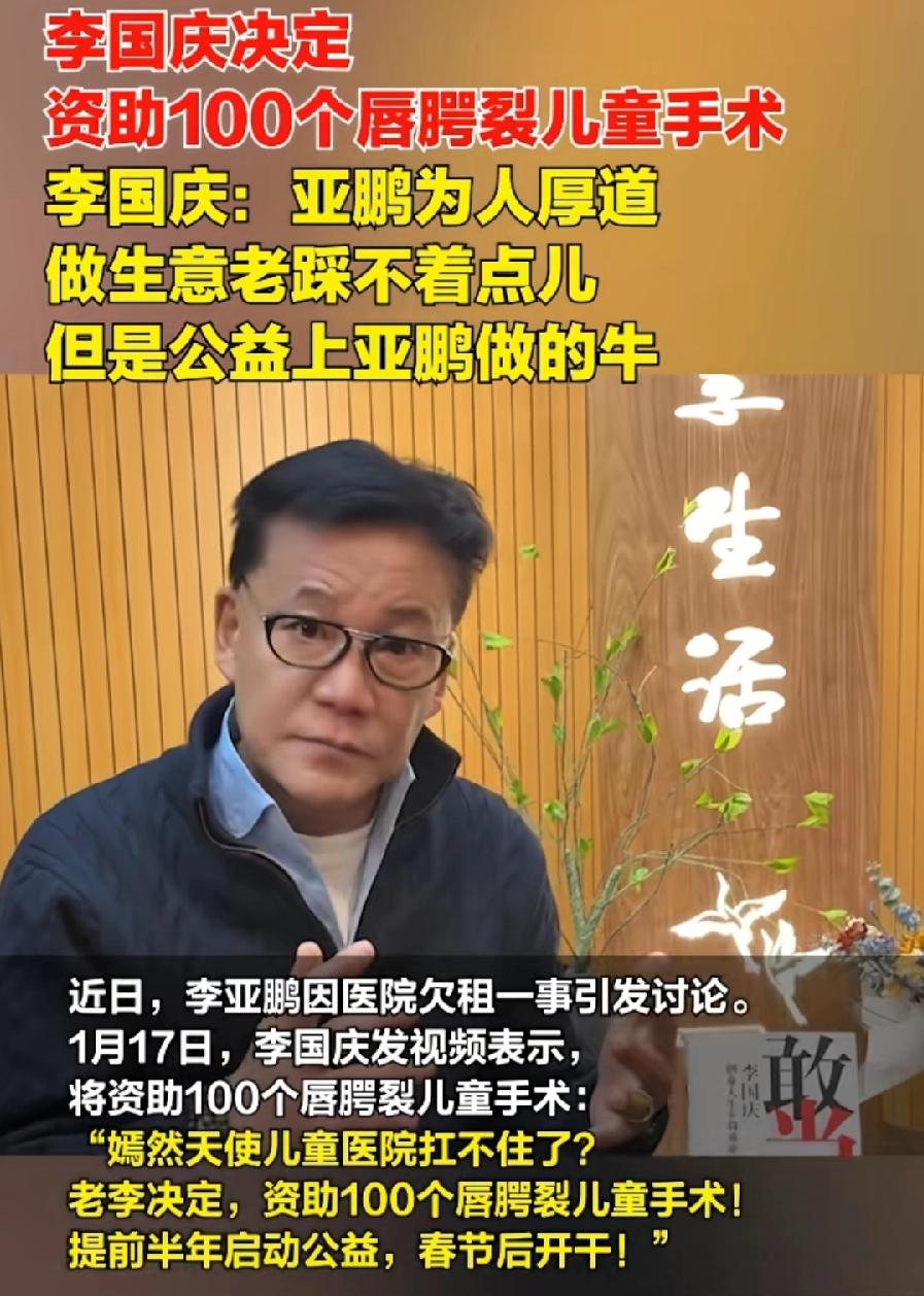 李国庆被李亚鹏感动了!决定资助100个兔唇儿童手术!一个手术平均1万,得出100万,为李国庆点赞!而且身为网红企业家,带了一个好头,吸引更多网友关注,李亚鹏、嫣然儿童医院、兔唇患者!看李亚鹏发的视频,目前嫣然儿童医院面临经营困难,希望更多企业家富豪能跟进,助力李亚鹏慈善公益事业!