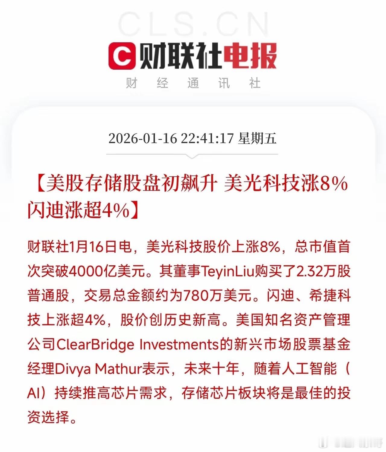 周末利好,大利好。存储芯片是今年最靓的仔。从去年到今年,存储芯片的价格不断上调,相关概念板块也是不断上涨。昨晚美股存储股盘初又飙升,美光科技涨8%闪迪涨超4%。下周一持有相关概念股票的朋友,又能吃到肉了,周末可以提前开香槟庆祝了。财联社1月16日电,美光科技股价上涨8%,总市值首次突破4000亿美元。其董事TeyinLiu购买了2.32万股普通股,交易总金额约为780万美元。闪迪、希捷科技上涨超4%,股价创历史新高。存储芯片价格不断上涨的核心原因主要是以下:①核心是AI驱动需求暴增②供给端结构性收缩③叠加寡头格局控价与库存见底④形成供需错配的长周期行情 存储芯片涨价对产业链、企业、个人与投资都将产生直接影响,如下:①核心是成本上行、②结构分化③终端调价④AI算力更贵总之,存储芯片的不断涨价,对于相关企业的来说是大利好,对其业绩的提升是显而易见的,最直接的表现形式将会反应在股价上。但是对于存储芯片的购买方来说,是利空的,原因很简单,成本越来越高了,需求就会降低。最后,恭喜那些持有存储芯片概念股票的朋友们,下周继续吃肉,做梦都能笑醒了。