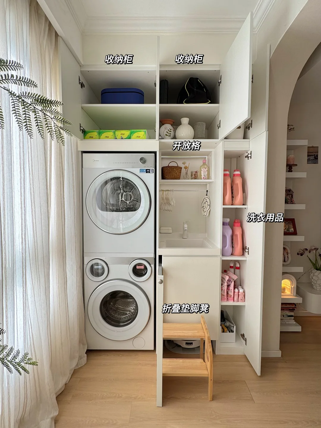 一侧做上了储物镜柜,一侧安排上洗烘套装,空间利用率直接拉🈵!