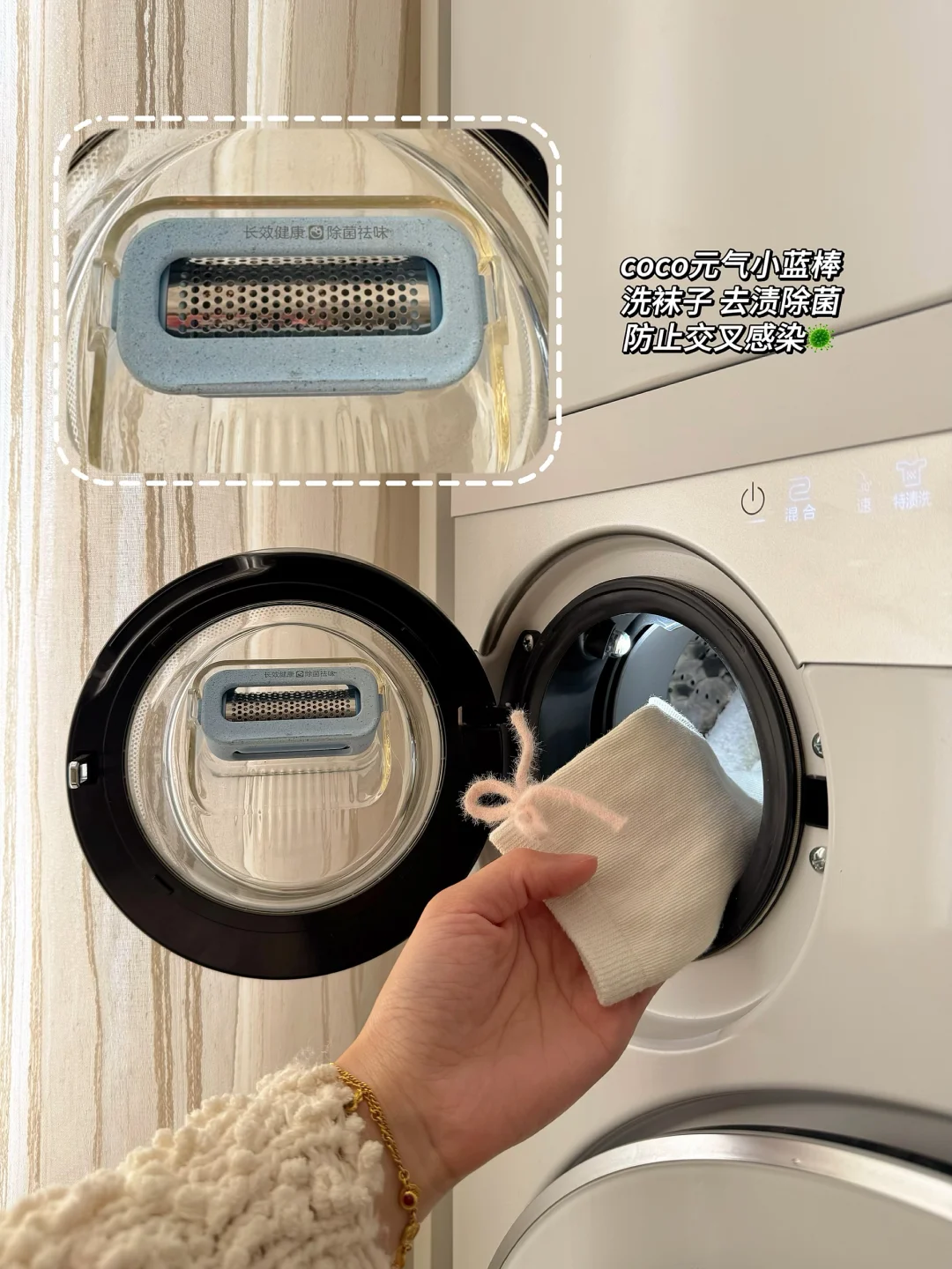 左边小蓝棒专洗袜子,深入袜子纤维去除汗渍、真菌,右边小粉棒专洗贴身内衣裤,