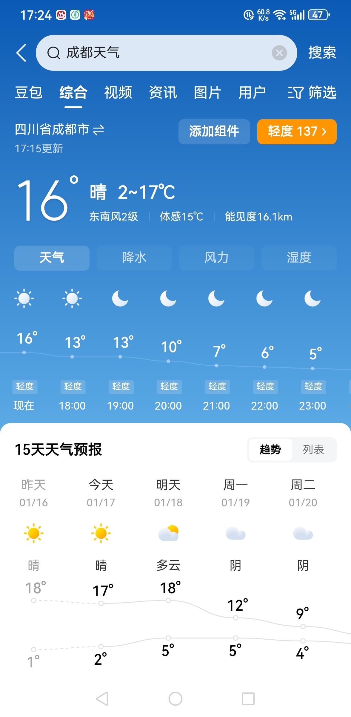 2026年1月17日下午17点,成都和重庆天气,一目了然。