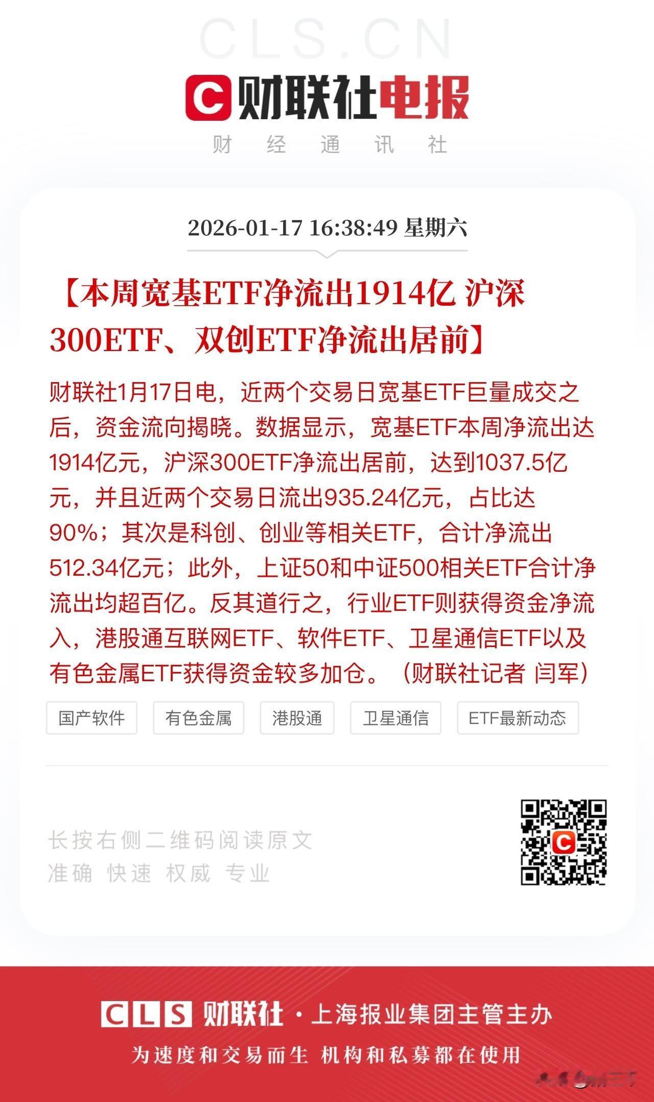宽基ETF本周净流出1914亿, 上证50、中证500、沪深300流出居前, 资金流入软件、卫星、有色金属等热门行业! ETF从12月上旬的日均4000亿成交量, 放大到本周日均7000亿成交量, 可以想象得到周涨幅15%-20%的ETF, 基民完全把它当成一只个股在炒了! 卖出以后发现继续走高, 然后又接回去, 外围资金受不住诱惑进场, 大主力机构回归, 居民储蓄持续搬家, 都是增量资金来源的主要贡献力量! 但随之而来的一盆冷水、一脚刹车, 市场恍然大悟要有基本面和业绩, 然后猛推半导体设备、存储芯片、有色金属! 很多股民、基民都是两头跑, 最后空余恨! 牛市就是要认准主线, 牢牢抱紧、一动不动, 等待春风拂面、吹泡泡! …