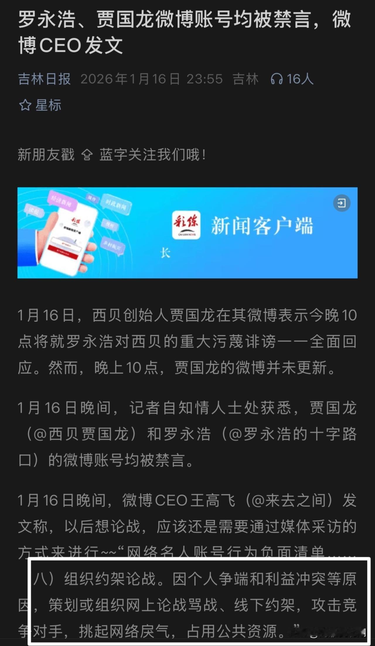 罗永浩和贾国龙均被微博禁言 我感觉这波还真随了贾国龙的心愿,罗永浩是一个依靠流量带货吃饭,并没有实体产业的网红,账号对于他来说很有用,对贾国龙来说,他用自爆的公关方式还真极限把罗永浩给一换一了,对他来说没有微博账号也不亏。 这其实也是当年社会大哥的打法之一,互爆,一起进去。