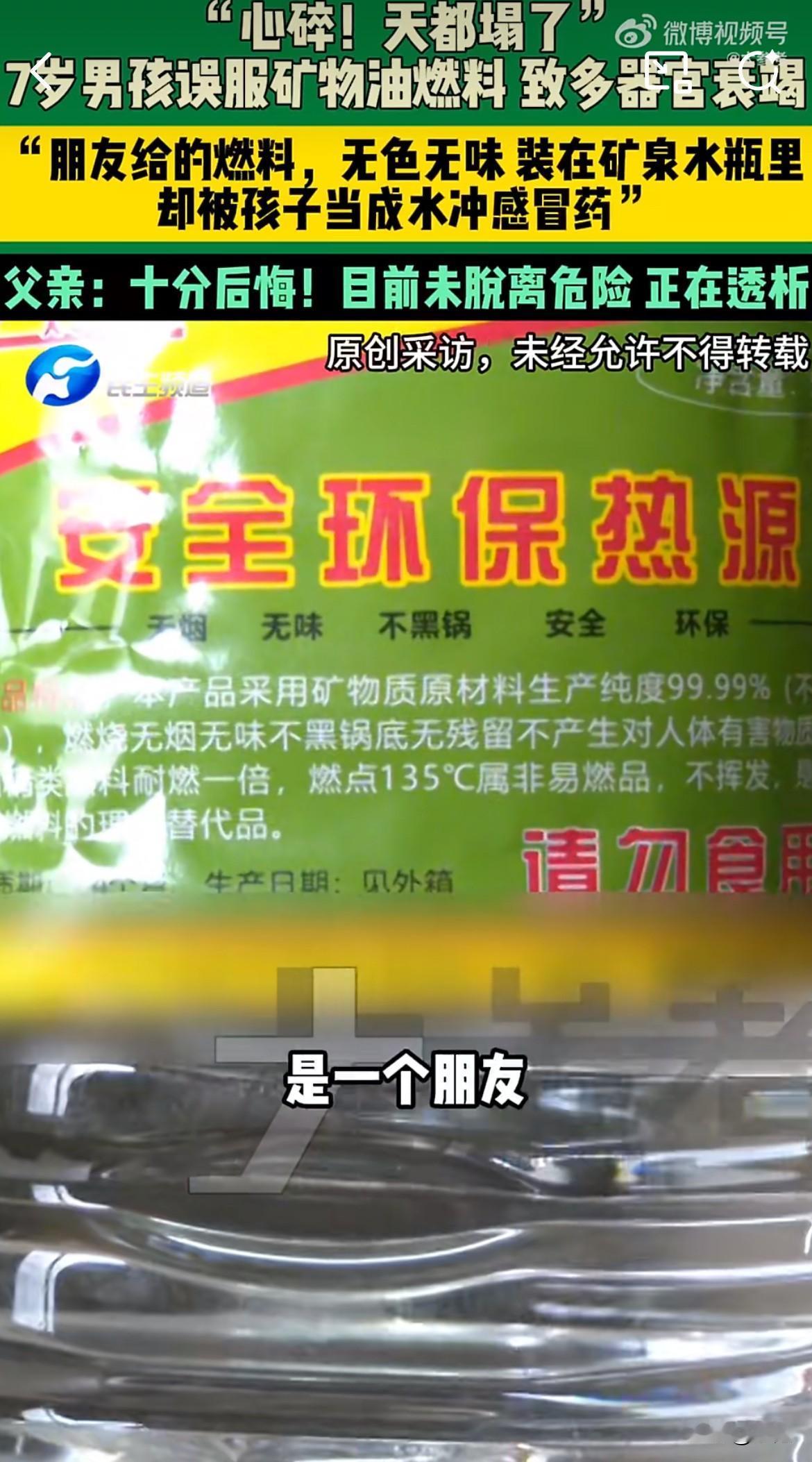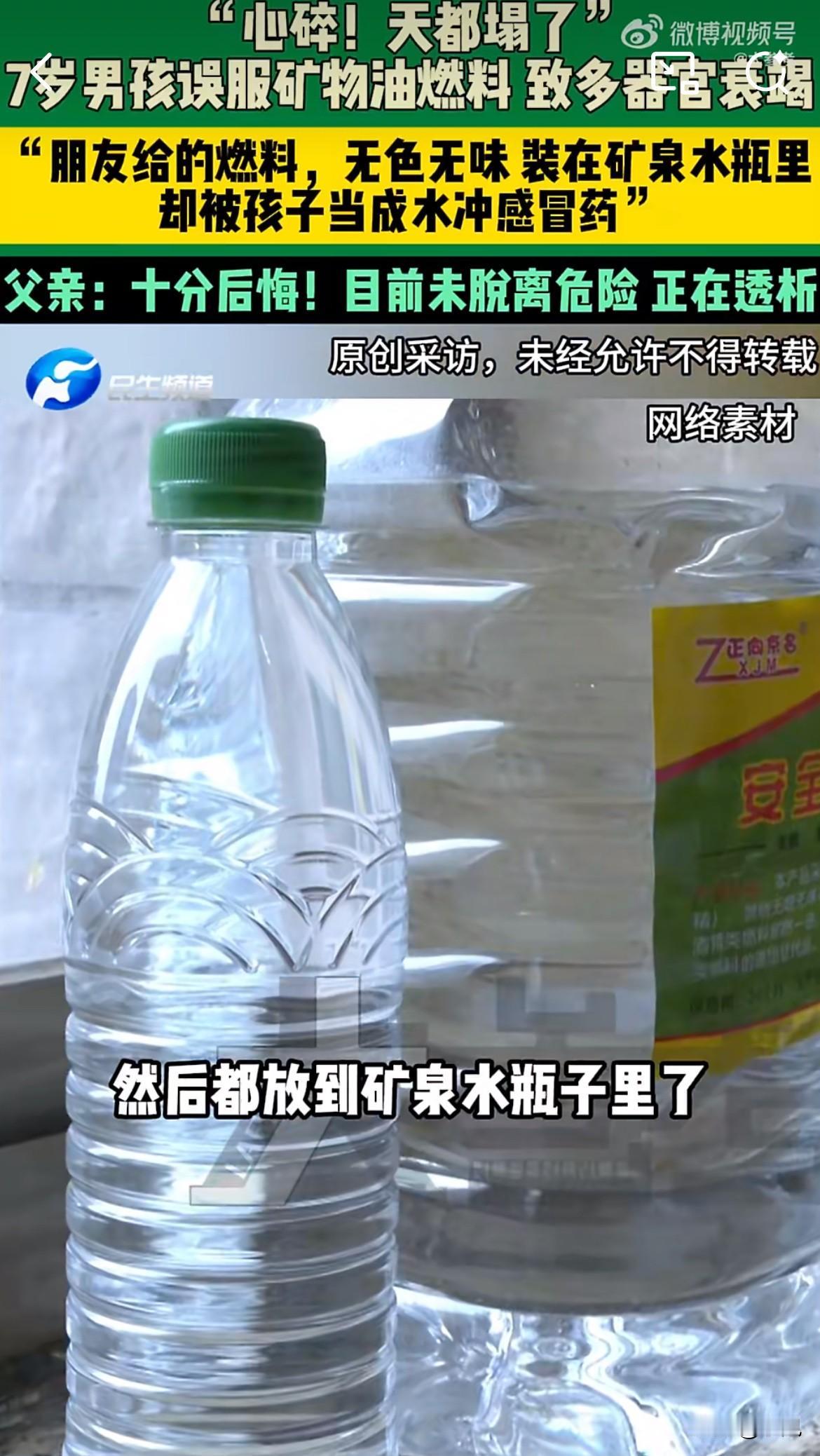 千万不要用矿泉水瓶装其他的液体! 1月16日,河南郸城县,一个7岁孩子感冒了,爷爷在屋里找到一瓶“矿泉水”,兑上温水给孙子冲感冒药。孩子喝下后说味道不对。一个电话打过去,真相如晴天霹雳:那瓶子里装的不是水,是从火锅店拿来的无色矿物油燃料。 孩子被紧急送医,不到一小时就开始呕吐、昏迷,急性肝衰竭、肾衰竭。现在他躺在郑州医院的ICU里,昏迷不醒,全靠呼吸机和血液净化机维持着脆弱的生命。 喝下去的,是温柔的毒药 这种矿物油,属于碳氢化合物,和汽油、煤油是“近亲”。它看起来清澈无害,毒性却猛如虎。 它的可怕之处在于粘度低,像水一样容易流动。一旦误服,极易呛入气管,钻进肺部。在肺里,它不是在表面,而是直接破坏肺泡,引发严重的化学性肺炎。这就是孩子迅速出现呼吸衰竭的原因。 更危险的是,这类物质如果被大量吸收进入血液,会直接攻击中枢神经系统、心脏和肝脏。急性肝衰竭、肾衰竭就是这样发生的。医学资料明确指出,5岁以下儿童误服此类物质,常可致命。 一个致命误区:千万别催吐! 事件中最让人揪心的是,很多人在慌乱中会犯一个可能致命的错误——给孩子催吐。 这是绝对禁止的。 因为催吐时,矿物油会随着呕吐物再次经过咽喉,极易被吸入气道,造成二次、甚至更严重的肺部损伤。广州曾有一个1岁男童误喝煤油,家人催吐后,孩子立刻呼吸急促,病情急剧加重。 正确的做法是:立即送医,带上误服的容器。不要喂水、喂牛奶试图稀释,这反而可能加速毒物吸收或引起呕吐。 生死拉锯战,ICU里的战斗 孩子转院到的郑州医院,急诊科是区域诊疗中心,具备抢救急危重症的能力。但面对这种中毒,医学上目前没有特效解毒药。 治疗是一场艰难的支撑战。医生能做的,就是用呼吸机代替他衰竭的肺,用血液净化机(类似透析)勉强替代他衰竭的肾,清除血液里的毒素,为肝脏和肾脏自我修复争取渺茫的时间。 北京市卫健委的一则科普显示,一名误服矿物油的成人,中毒后经历了从头晕呕吐,到精神混乱、呼吸困难,最终陷入昏迷、多器官衰竭的过程。孩子正在经历的,就是这样一场全身多个系统的崩溃。 爷爷的一句“对不起”,背后是千家万户的警示 视频里,爷爷自责道歉的画面,让人不忍直视。但错真的只在爷爷吗? 把工业燃料装进矿泉水瓶,这个动作本身,就埋下了悲剧的种子。生活中,用饮料瓶装汽油、机油、清洁剂、农药的事情太常见了。每一次,都是在玩火。 这个7岁男孩的悲剧,是用生命在呐喊:任何非食用的液体,特别是无色透明的,绝不能装在食品饮料容器里! 必须放在孩子绝对拿不到的地方。 此刻,ICU里那个小小的生命还在苦苦挣扎。我们祈祷奇迹发生。但比祈祷更重要的,是让这样的悲剧,不要再有下一次。
