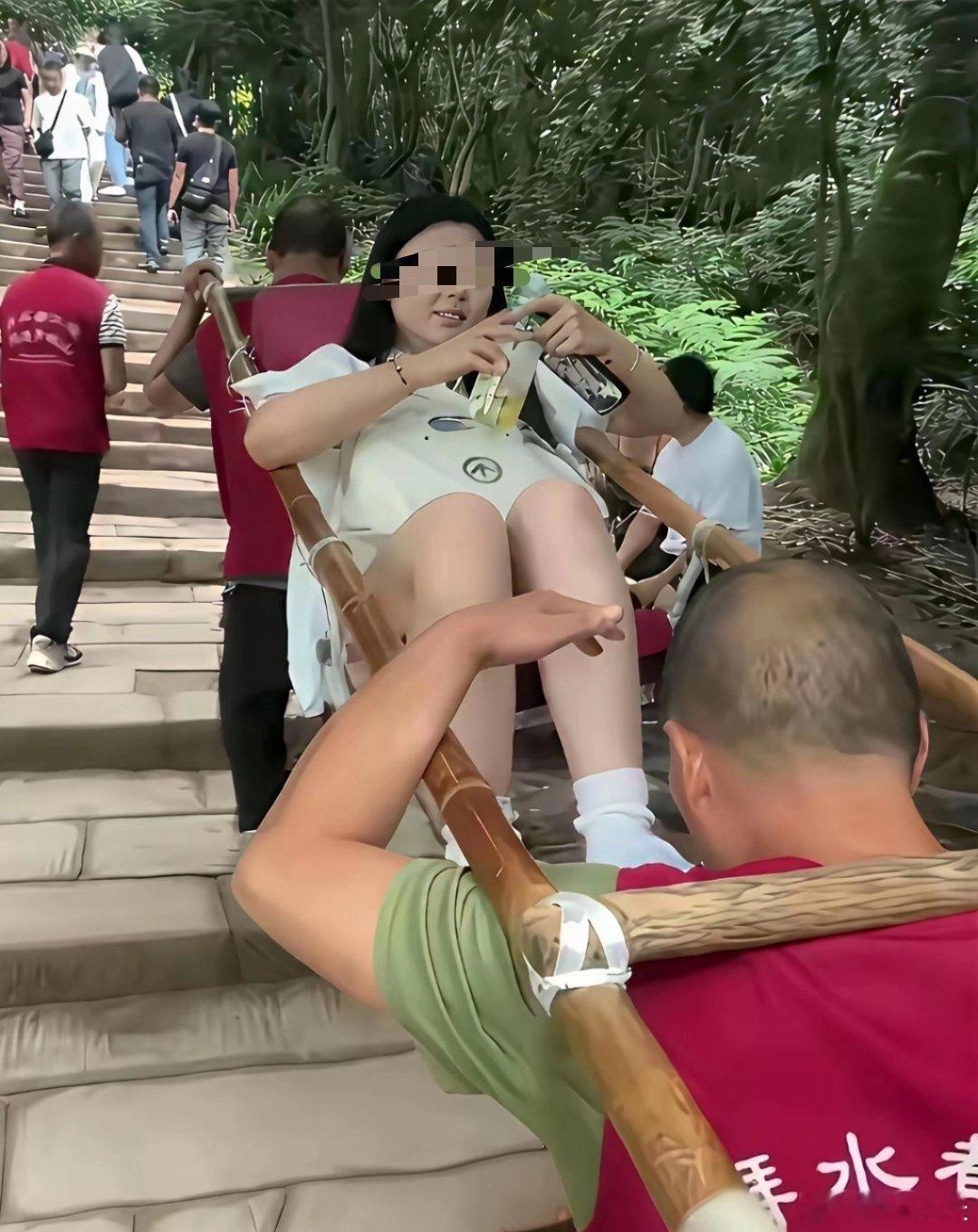 青城山的滑竿师傅还抬不抬头哎?这美女看着蛮开心。