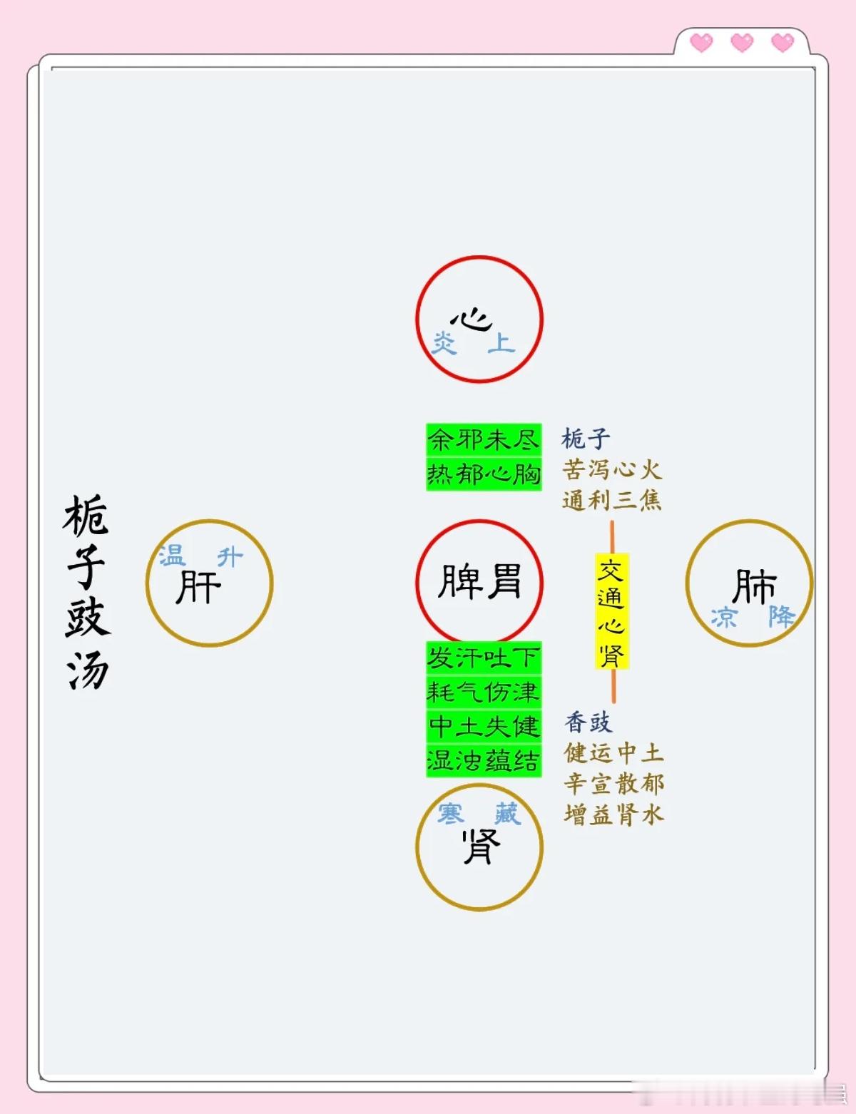 栀子豉汤核心病机与主证1.病机:热郁胸膈。多为外感病经汗、吐、下等法治疗后,表邪