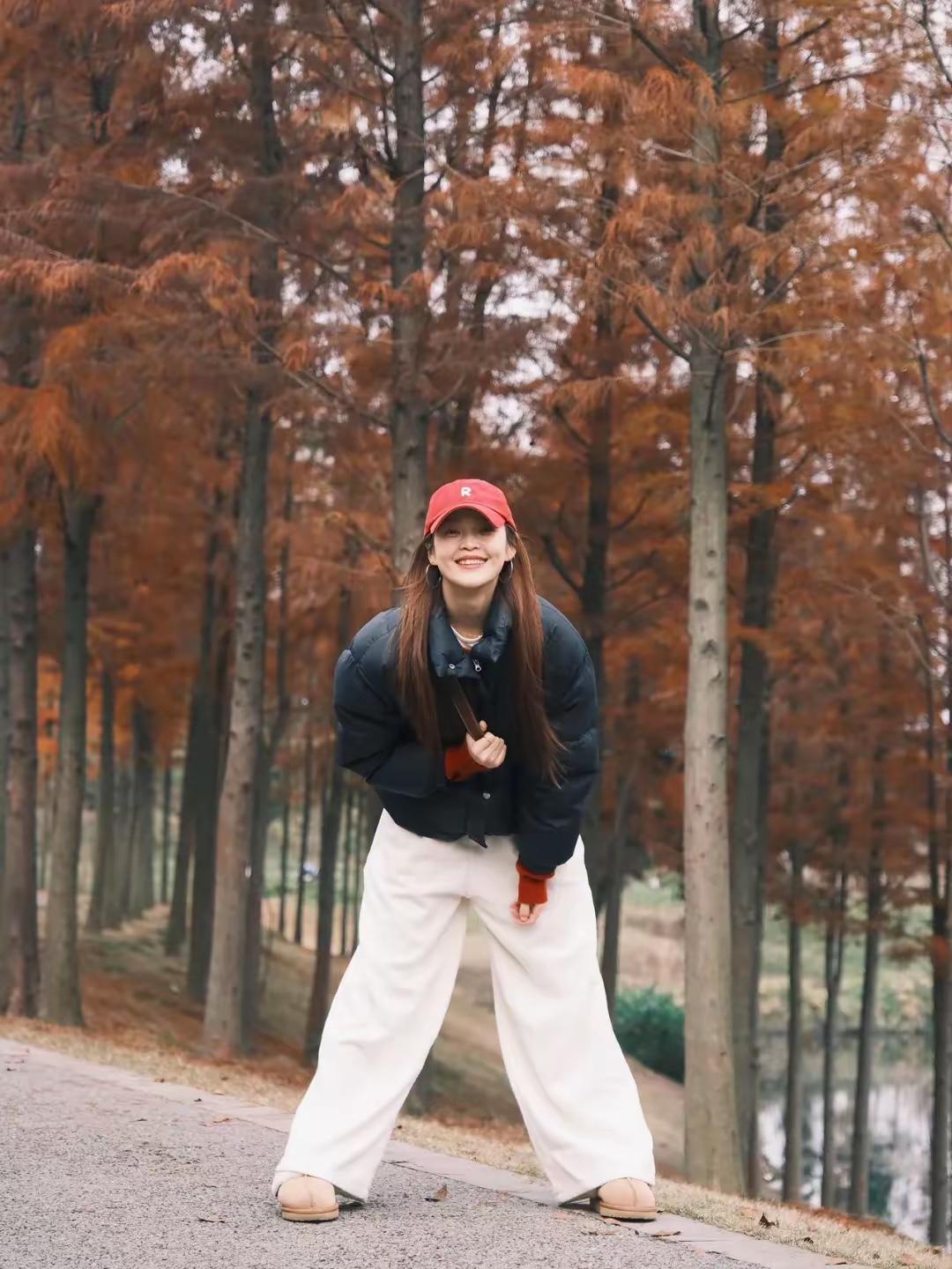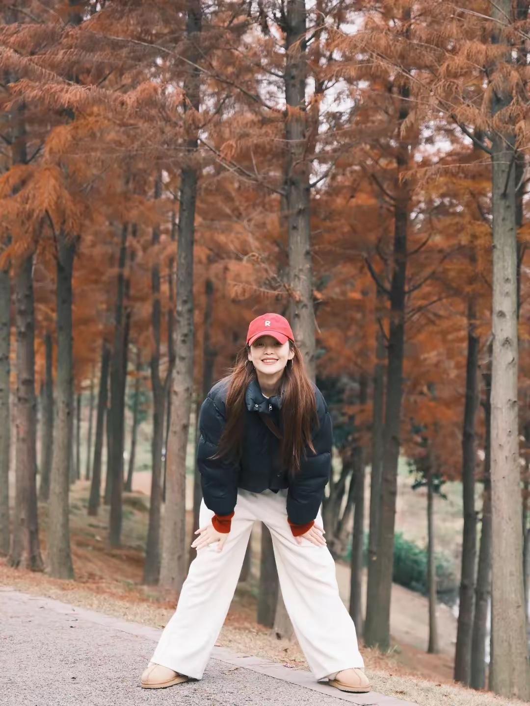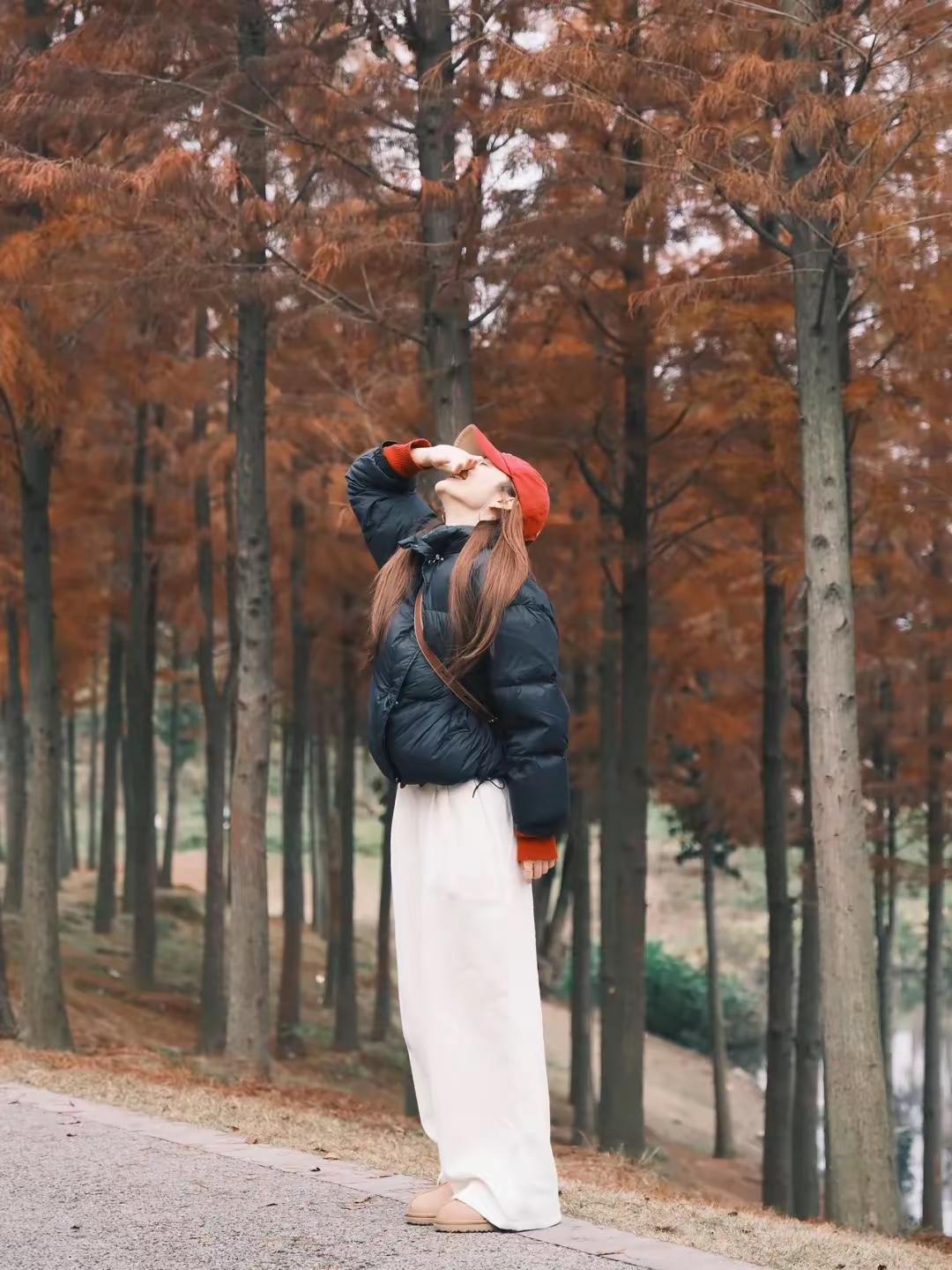 🍂 把烦恼丢进杉树林的风里,用松弛的姿态接住冬天的浪漫。 红帽、黑羽绒服、白裤子,在焦糖色的林间,每一个大笑和蹦跳都是我和季节的默契。 不用刻意追赶什么,站在这里,就已经是风景啦✨