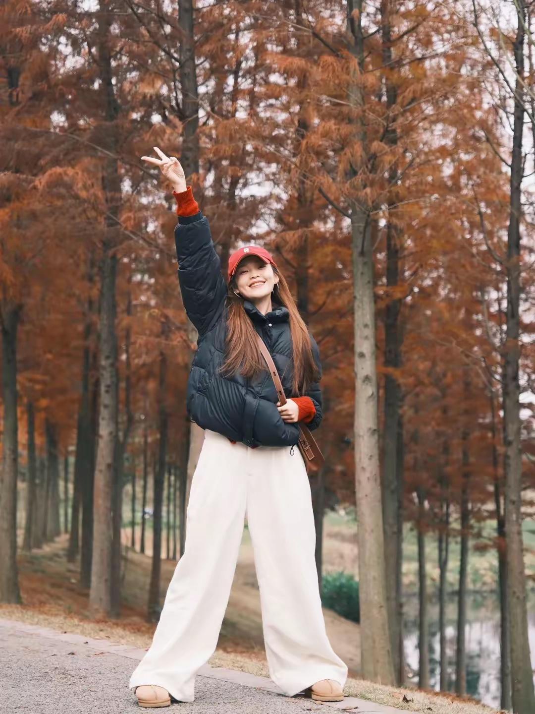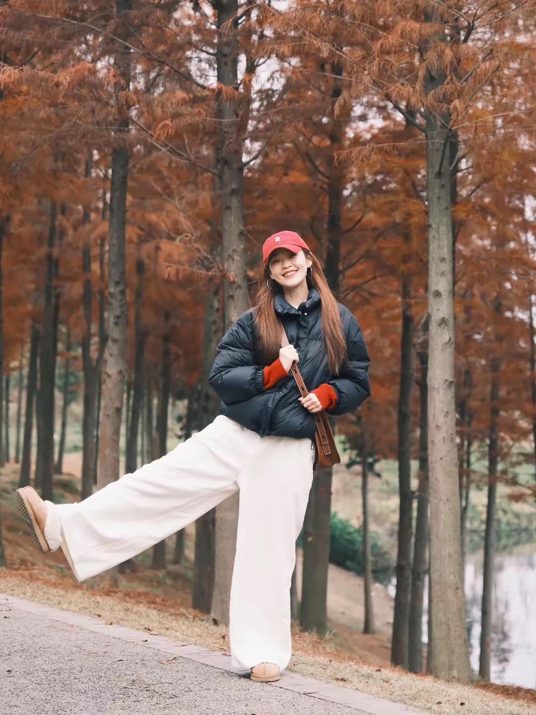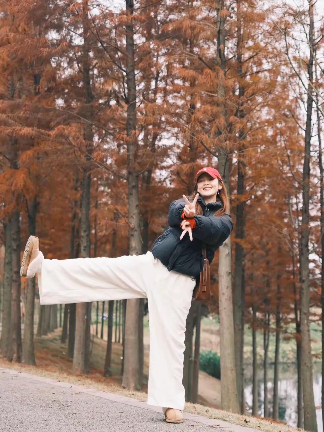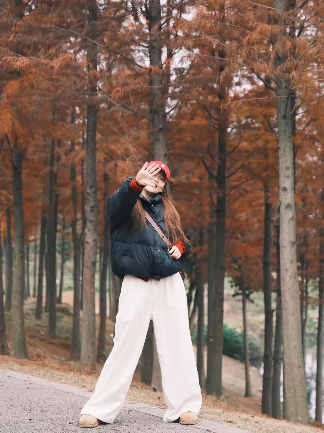 🍂 把烦恼丢进杉树林的风里,用松弛的姿态接住冬天的浪漫。 红帽、黑羽绒服、白裤子,在焦糖色的林间,每一个大笑和蹦跳都是我和季节的默契。 不用刻意追赶什么,站在这里,就已经是风景啦✨