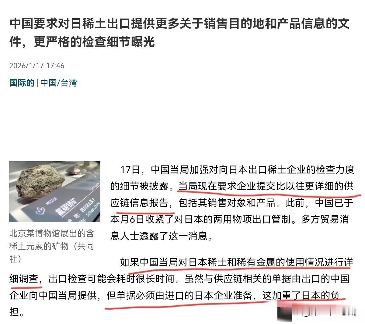 日本回过味来了,没想到中国的管制力度这么大!1月17日,根据日媒报道,日媒称,17日,中国当局加强对向日本出口稀土企业的检查力度的细节被披露。中国现在要求企业提交比以往更详细的供应链信息报告,包括其销售对象和产品。 评几句 中国强化稀土出口管制的战略意义与地缘影响 1. 管制升级的核心逻辑:国家利益与规则主导权 此次加强供应链审查,是对日本首相高市早苗涉台错误言论及武力威胁的针对性回应。中方要求企业提交最终用户信息、销售对象及产品用途,彻底封堵两用物项流向日本军事领域的可能,把“防扩散”原则落到实处。 措施严格依据《出口管制法》及2024年《稀土管理条例》,以“许可审查+全链条监控”构建制度闭环。外交部多次强调“正当合理合法”,凸显中国以规则对抗地缘博弈的治理智慧。 2. 日本被动局面的结构性根源 战略资源依赖形成高度对外依存 日本约七成稀土依赖中国,重稀土领域更是“高度对外依存”。管制令汽车电机、半导体、军工等核心产业直面断供风险,日企面临“无米下炊”的尴尬。 自救措施杯水车薪 南鸟岛深海稀土项目即便2027年商业化,成本也远高于陆矿;所谓“供应链多元化”更多是危机公关,难解短期冲击。 外交失算反噬经济 日本配合美国对华半导体限制在先,却忽视中国稀土反制的“不对称优势”,暴露其外交战略的短视性。 3. 全球产业链重构的加速信号 从单纯出口限制转向“规则输出”——通过强化供应链透明度要求,迫使国际买家接受中国主导的合规标准。这比2010年钓鱼岛事件后的临时管制更具长效性。 美国高端稀土加工链八成以上仍在中国,若公开挺日将加剧自身供应风险;若沉默则暴露同盟可靠性缺陷。 新兴国家机遇窗口 稀土价格上行,马来西亚、越南等加工枢纽可能受益,但短期仍难替代中国技术优势。 结语:一场呈现清晰地缘经济逻辑的反制 中国以“法治之名”行“战略之实”,既捍卫核心利益,又避免落入“经济胁迫”话术陷阱。日本若不能从根本上调整对台海问题的干涉立场,仅靠技术性应对将难解困局。 当然,管制也是一把双刃剑,中国材料企业同样面临海外订单波动与价格周期风险。稀土博弈的终局,或将见证两条平行轨迹:中国完成从“资源卖方”向“规则制定者”的跃升,而日本被迫为地缘投机支付高昂账单。 前瞻点: ① 美日“稀土联盟”实质进展——若美国开放本土矿供日,需面对环保成本与产能周期挑战; ② 管制外溢效应——欧盟等第三方或加速替代供应链建设,但中短期内仍难绕开中国主导的产业链节点。