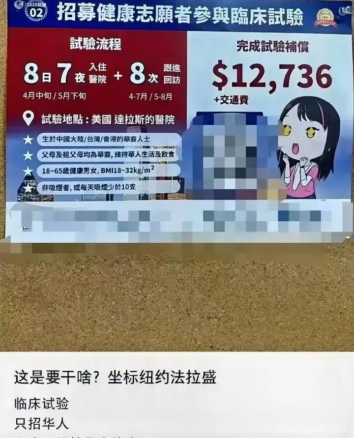 最近华人圈疯传的招募信息让人脊背发凉:美国机构开出16000美元天价,招募药物测试志愿者,核心要求却只有一个——祖上三代必须是纯汉族! 要知道,国内常规药物试验报酬不过几千元,美国本土高风险测试也才数千美元,这超常规的溢价背后,藏着比金钱更沉重的代价。所谓“三代纯汉族”的苛刻条件,哪里是招募试药者,分明是在精准筛选基因样本——汉族特有的CYP2C19代谢酶特征、1367个特有蛋白编码基因,都是他们觊觎的“核心数据”。这些数据一旦被非法利用,很可能成为针对特定族群的基因武器研发素材,国安部早已多次发出警示。 更让人细思极恐的是,这不是美国第一次染指人体实验黑产。二战结束后,美国以豁免战犯为条件,从731部队头目石井四郎手中,攫取了全部活人实验、细菌战数据,甚至让石井成为德特里克堡实验室顾问 。当年731用刺刀强制中国人做实验,如今美国换了套路,用高薪诱惑在生活压力下挣扎的同胞“自愿”入局——本质都是对生命的漠视,对族群的掠夺。 别以为“躺几天就能赚钱”是好事!试药中心一天数十次抽血的折磨、未上市新药的未知副作用、全外文免责条款的陷阱,以及海外试验近乎空白的监管,都意味着你赌上的是终身健康 。广州海关曾破获10万份孕妇血样走私出境案,这些教训都在提醒我们:民族基因安全没有小事,个人健康更是千金不换。 别为了眼前的小钱,成为别人实验台上的“素材”,守护自己,就是守护我们的民族底线! 新药测试
