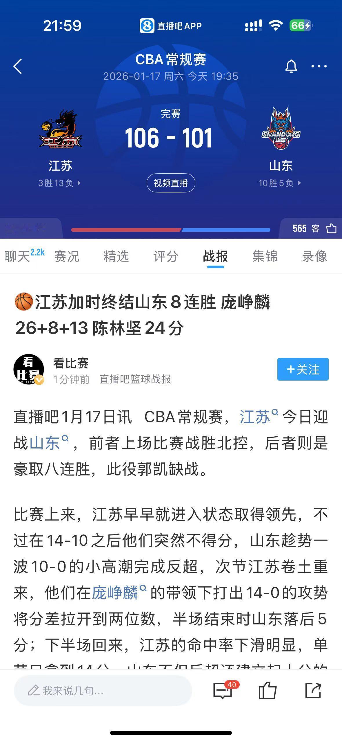 江苏的球迷,广西的球迷,今晚过年啦,今晚过年啦,吃饺子,吃饺子! 还得是庞老六,庞增峥麟啊! 江苏居然破天荒了,终结了山东的八连胜。 庞老六今晚牛逼了,26分8篮板13助攻。 不愧是,广西超跑,他的速率和这个CBA不是一个级别的。 快了,至少,半档。 活该,他抖音球迷多。 果然,汗水不会说谎。 广西庞峥麟 竞技体育也不会说谎。 江苏破天荒的连胜了。