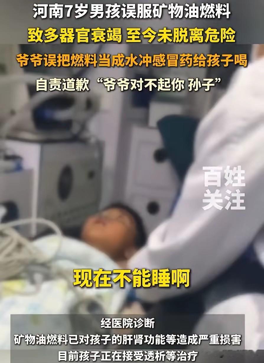 “天都塌了!”河南郑州,一名7岁男孩感冒生病,爷爷就用矿泉水瓶里的水给孩子冲药喝,可孩子喝了一口就发现不对劲,随后更是呕吐不止,神志不清,爷爷打电话问孩子爸爸,才知道里面根本不是矿泉水,而是矿物油燃料 河南郑州最近发生的一件事,让无数家长揪心到睡不着。7岁的小男孩小宇(化名)只是普通感冒,爷爷随手拿起桌上的“矿泉水瓶”冲药, 可孩子刚喝一口就脸色大变,短短几小时内呕吐抽搐、神志不清,送到医院直接被推进ICU,诊断结果让全家崩溃——瓶子里装的根本不是水,而是无色无味的矿物油燃料。 事情发生在1月中旬的一个清晨,郑州的气温还带着刺骨的寒意。小宇早上起来咳嗽流涕,精神蔫蔫的,爷爷心疼孙子,赶紧找出家里的感冒药,想着冲给孩子喝了能舒服点。 转身去客厅找水时,爷爷看到茶几上放着一瓶没贴标签的透明液体,瓶身是常见的矿泉水瓶样式,里面的液体清澈透亮,看着和白开水没两样。没多想,爷爷就拧开瓶盖倒了半杯,麻利地冲开感冒药,递到小宇嘴边。 小宇抿了一小口,立刻皱起眉头,嘴角往下撇,说不出哪里不对劲,只觉得喉咙发黏、味道怪异。 爷爷以为是感冒药本身发苦,还哄着孩子多喝两口,可小宇刚把药咽下去,就猛地捂住肚子,趴在沙发上剧烈呕吐起来,刚喝进去的药和水全吐了出来。 起初爷爷以为是孩子肠胃不适,可没过十分钟,小宇的呕吐越来越频繁,脸色变得惨白,嘴唇开始发紫,眼神也变得涣散,说话都含糊不清,最后直接瘫在沙发上失去了力气。 看着孙子突然变成这样,爷爷吓得手脚发软,赶紧掏出手机给儿子打电话。 电话里说完情况,儿子的一句话让爷爷如遭雷击——那瓶“矿泉水”根本不是水,是前几天朋友来家里烤火时留下的矿物油燃料,朋友说这东西燃烧效率高还没异味,就临时装在空矿泉水瓶里,随手放在了茶几上,忘了特意提醒家人。 挂了电话,爷爷抱着昏迷的小宇,手抖得连车门都打不开,邻居见状赶紧帮忙联系救护车,一路鸣笛将孩子送往河南省儿童医院。 急诊医生初步检查后,立刻安排了紧急抢救。抽血化验结果出来,所有人都倒吸一口凉气:小宇血液中检测出大量烃类化合物,肝功能指标比正常数值高出10倍,肾功能已经濒临衰竭,属于急性矿物油中毒引发的多器官损伤。 医生解释,这种矿物油燃料黏度低、挥发性强,一旦进入人体,会快速黏附在消化道黏膜上渗透进血液,不仅会破坏肝肾等脏器功能,还可能引发吸入性肺炎,对儿童来说,只需10毫升就可能致命,而小宇当天至少喝了30毫升。 抢救过程中,医生先为小宇进行洗胃,抽出的液体泛着一层油花,随后又紧急启动透析治疗,替代受损的肾脏进行排毒。 小宇全身插满了管子,靠着呼吸机维持生命体征,小小的身体躺在病床上,每一次呼吸都牵动着家人的心。 在ICU外,小宇的爸爸蹲在走廊里,双手揪着头发反复自责,喉咙里发出压抑的呜咽声,妈妈则哭得几乎晕厥,嘴里不停念叨着“要是我在家就好了”。 经过几天的全力救治,小宇目前仍在ICU接受观察,虽然暂时脱离了生命危险,但后续还需要长期的透析和康复治疗,能否完全恢复还是未知数。 医生特别提醒,矿物油这类有毒物质无色无味,装在食品容器里时,成年人都难分辨,更别说孩子,而儿童的身体器官尚未发育成熟,对毒物的耐受度极低,一旦误服后果不堪设想。 事后了解到,小宇的父母平时工作忙,孩子大多由爷爷奶奶照顾,老人年纪大了,对这类隐藏的危险缺乏警惕, 而那位留下燃料的朋友,也只是图方便用矿泉水瓶装放,没意识到这种行为可能带来的致命风险。这场悲剧的发生,源于多个环节的疏忽,却让一个7岁孩子用身体承受了最沉重的代价。 对此,你们有什么看法,欢迎评论留言~