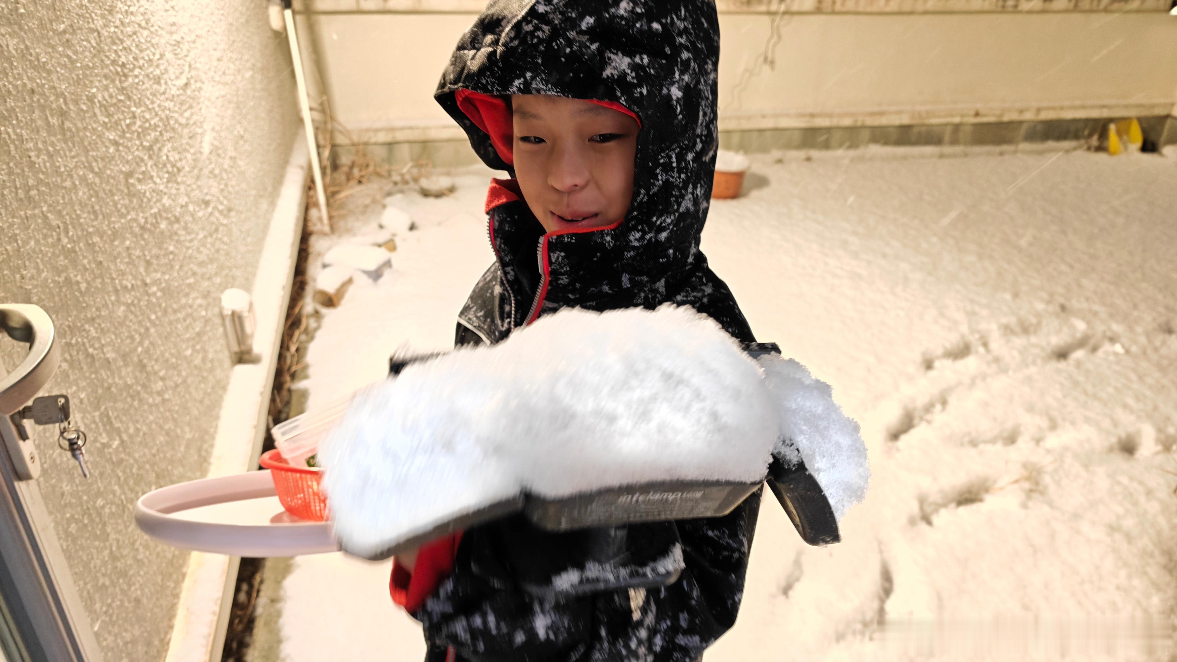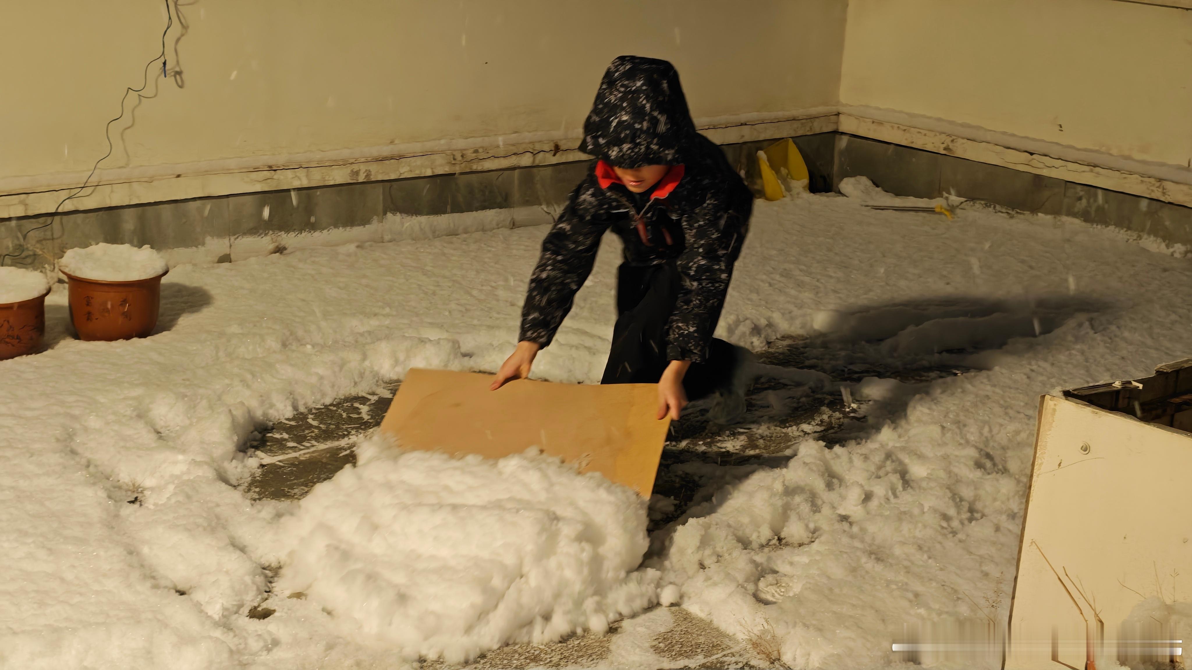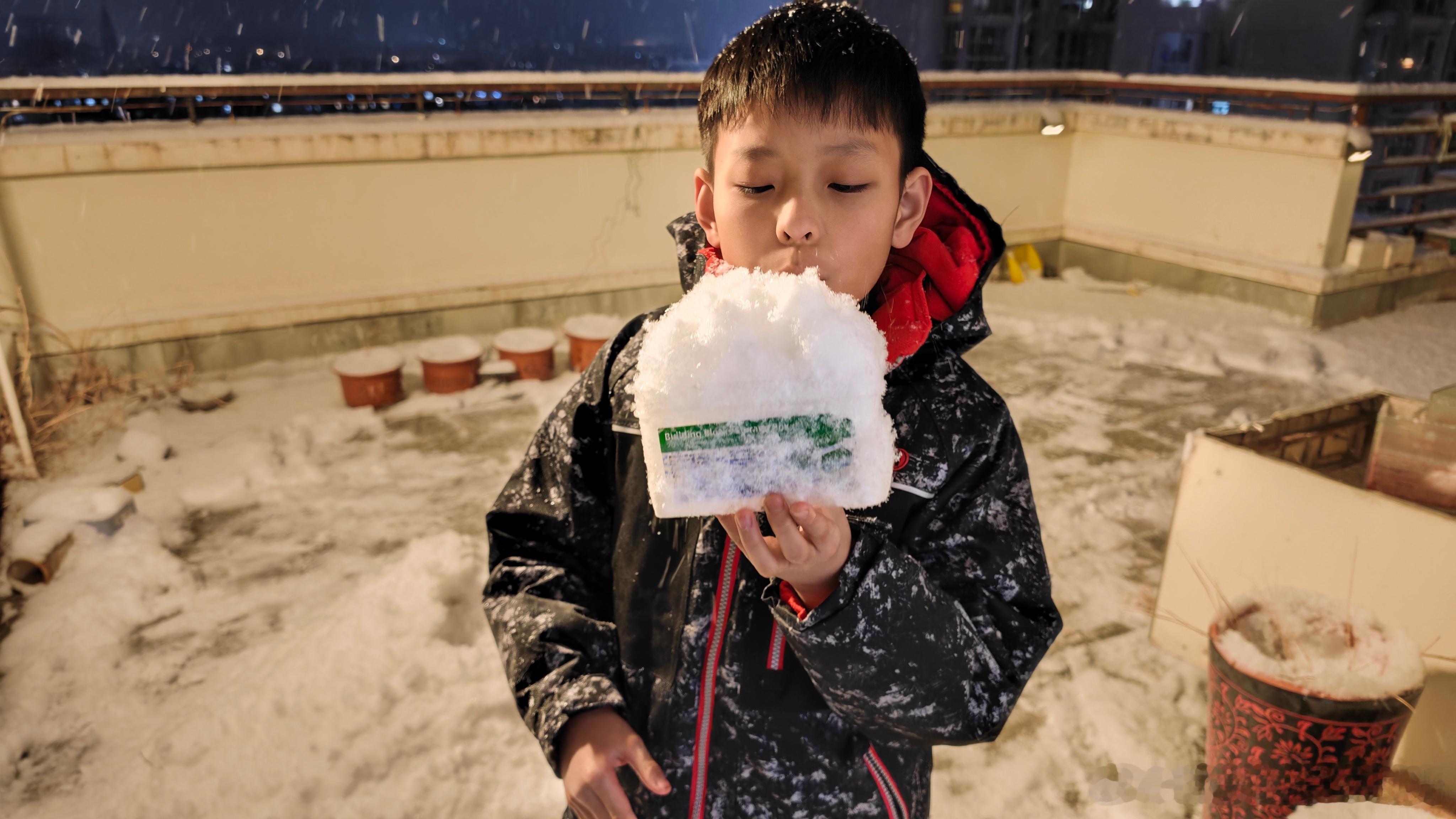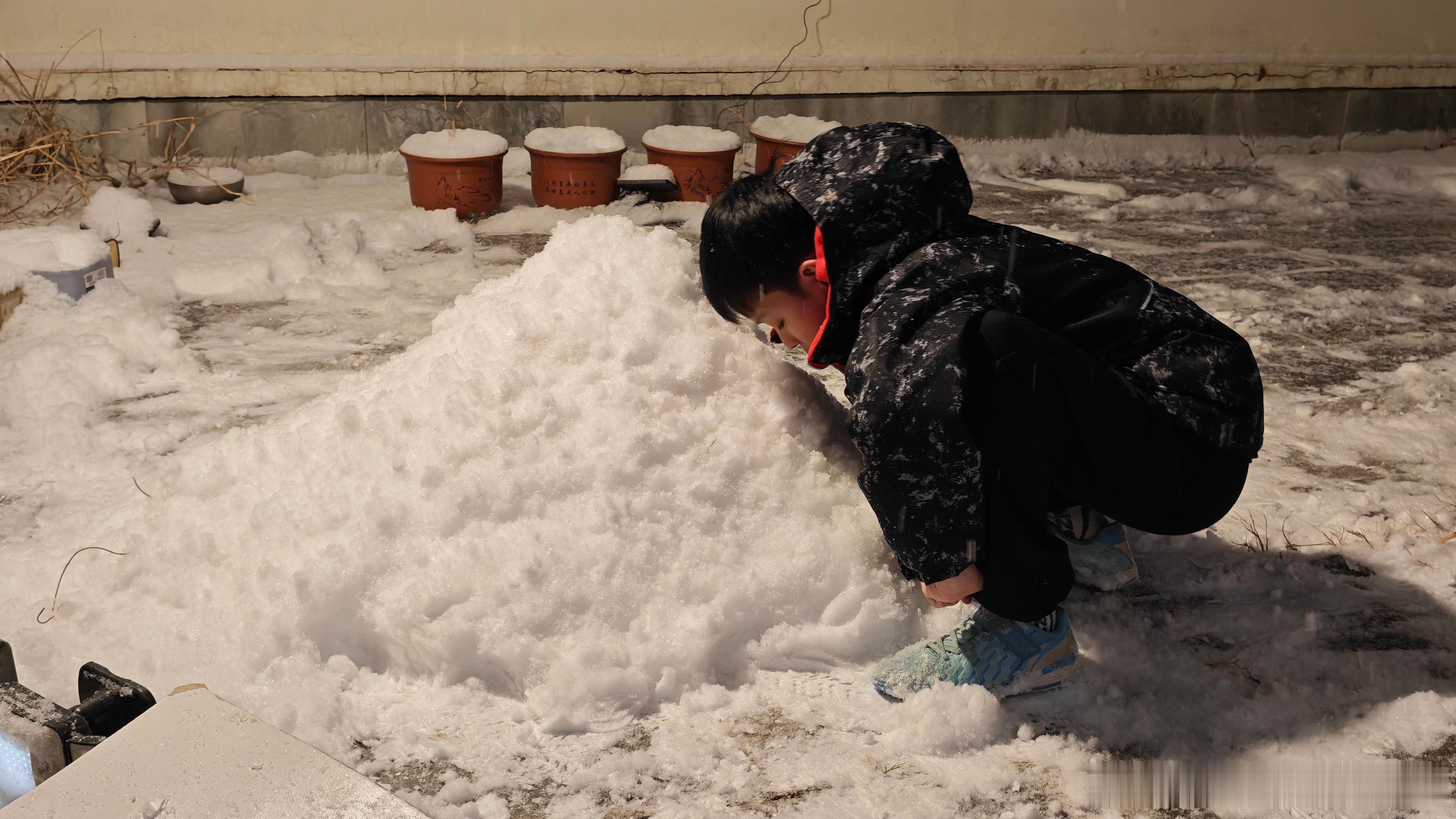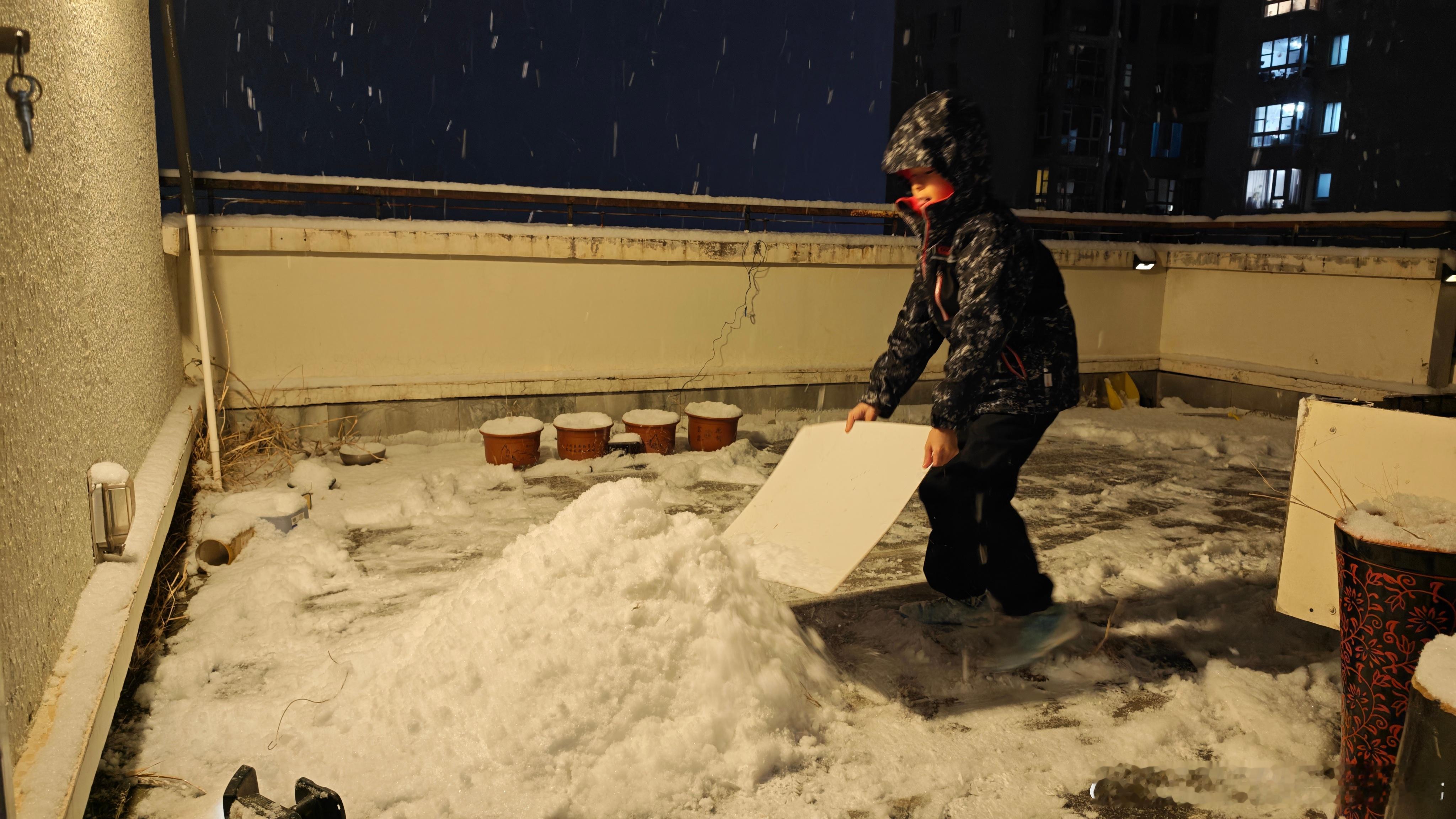北京的鹅毛大雪已经这么厚了,我儿太兴奋了,自己弄了个大雪山,还在那观察雪花的结构,品尝雪的味道,还弄回来一桶用吹飞机吹化观察它融化的过程,结果一大桶雪就化出这么点水,而且还很脏……这才知道刚才自己尝的都是脏水。小孩对世界充满了好奇,太有意思了。