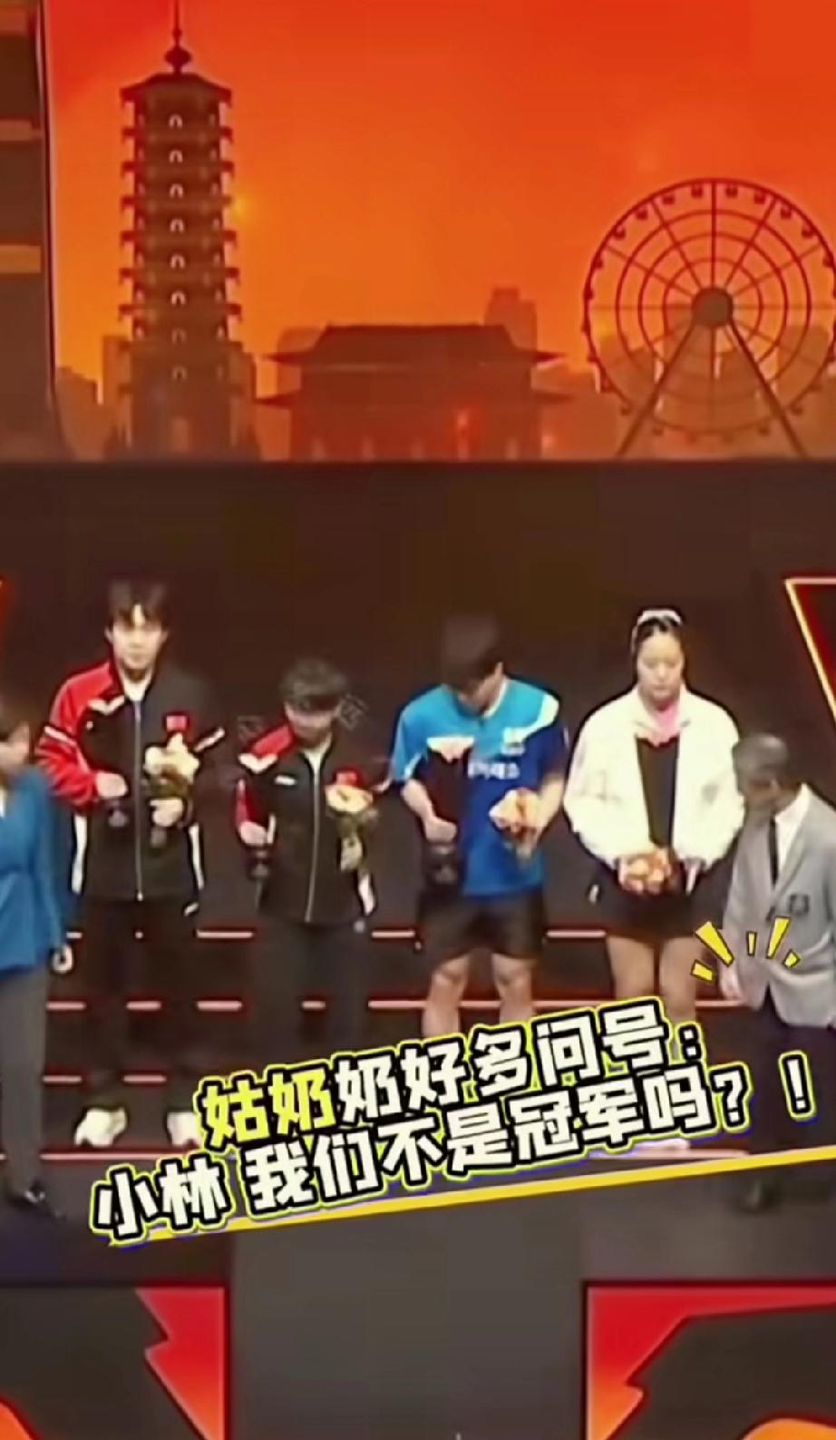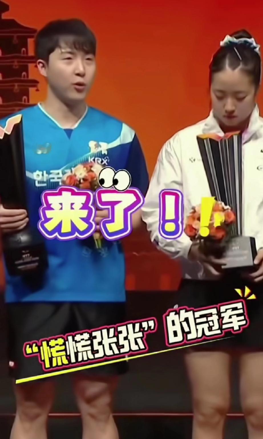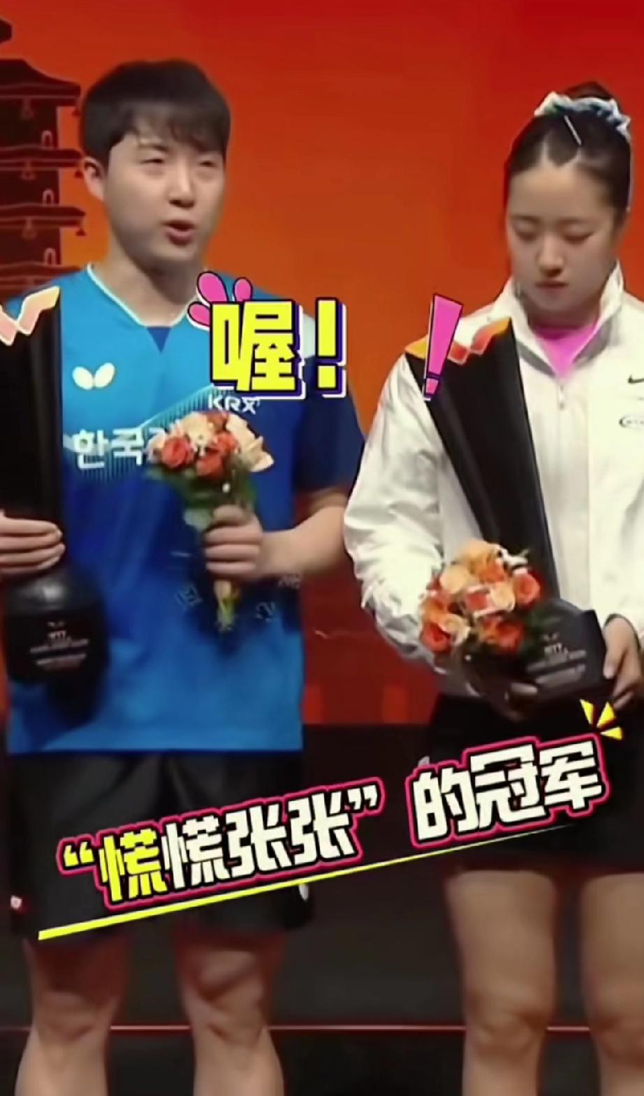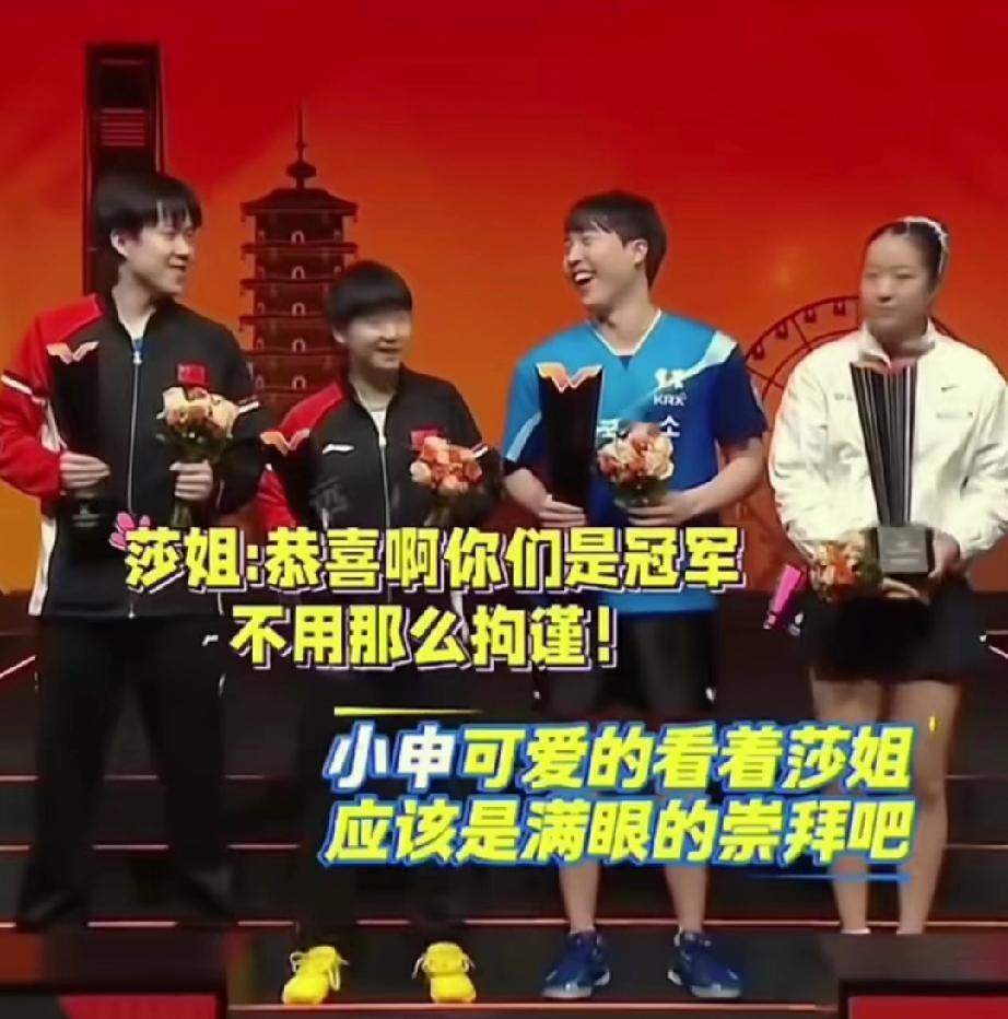 韩林和申裕斌虽然得了冠军,但是在领奖的时候面对莎头还真分不清谁是冠军。 WTT香