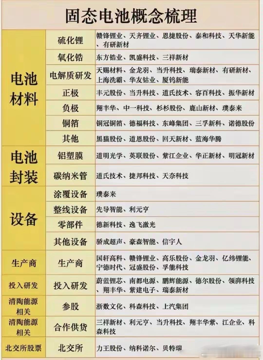 周末大消息!比亚迪启动GWh级全固态电池设备招标,广汽中试线投产,红旗电池包成功上车…固态电池要从实验室跑上公路了!2026年或是量产关键元年,这个板块正在闷声走强,上车机会要盯紧!一、技术突破扎堆落地,量产箭在弦上广汽:中试线投产,2026小批量装车测试,2028规模化商用比亚迪:GWh级产线招标,工程化放大能力显现,不再小打小闹 一汽红旗:固态电池包成功上车,全链条打通这不是偶然!头部车企加速协同,产业化节奏远超预期!二、2026-2030,固态电池黄金时代政策力挺:《新能源汽车产业发展规划》重点扶持,多地纳入产业链清单需求倒逼:液态锂电能量密度逼近天花板,固态电池理论密度500Wh/kg+(三元锂约250-300Wh/kg),安全+续航双buff拉满市场爆发:机构预测2030年全球规模破1500亿元,中国占近半壁江山三、产业链受益方向(附核心标的)1. 核心材料(固态电解质是灵魂)固态电解质:赣锋锂业(硫化物量产)、上海洗霸(氧化物LLZO吨级量产)、多氟多(聚合物电解质)正负极:容百科技(富锂锰基)、当升科技(高电压正极)、贝特瑞(硅碳负极)、璞泰来(锂金属负极)2. 专用设备(产线大升级)干法电极/真空镀膜/叠片设备:先导智能(整线方案)、海目星(激光切割)、杭可科技(检测设备)3. 整车与电池巨头(资金+技术+资源闭环)比亚迪、广汽、宁德时代、一汽等,自研自用快速迭代,构建护城河四、上车机会怎么看短期:关注设备招标落地与中试进展催化,设备商与材料龙头弹性大中期:跟踪2026年装车测试情况,验证技术与成本可行性长期:锁定有技术储备+稳定供应能力的核心企业,分享行业爆发红利核心标的速览(建议收藏)材料:赣锋锂业、上海洗霸、容百科技、当升科技、贝特瑞、璞泰来设备:先导智能、海目星、杭可科技整车/电池:比亚迪、广汽集团、宁德时代、一汽解放写在最后2026年,路上或将出现首批固态电池测试车!这是电池技术的颠覆性革命,也是A股的超级赛道。现在布局,就是把握新能源产业下一个十年的黄金风口!点赞的,来吃肉啦!转发给身边的股友,一起埋伏下一个大牛板块!