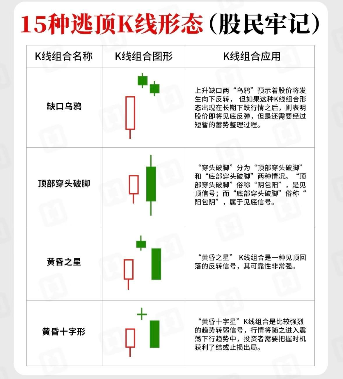 📈K线组合图解:掌握股市趋势,轻松交易!📈K线形态揭示涨跌信号:乌鸦缺口预警反转,穿头破脚辨顶底,黄昏之星见强转弱,投资者需把握时机灵活应对。K线形态揭秘:乌鸦预警反转,穿头破脚辨顶底,黄昏之星见转弱。股民巧识信号,把握买卖时机。
