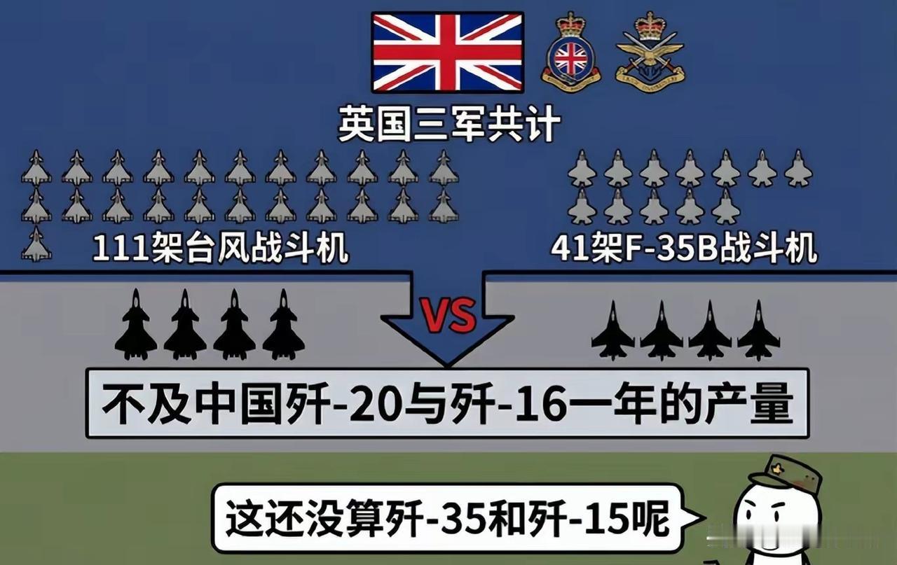 西方紧盯中国五代机产能:有1000架歼-20西太就是中国说了算? 英国智库推测2025年中国产120架歼-20,2030年或达1000架:F-35年产能140-150架,但美军仅购约60架,歼-20年产能120架仅供中国空军:作者认为歼-20实际可能700-800架,未来歼-35更多,需考虑六代机换装。 亚水 英国三军共计 111架台风战斗机 41架F-35B战斗机 个 不及中国歼-20与歼-16一年的产量