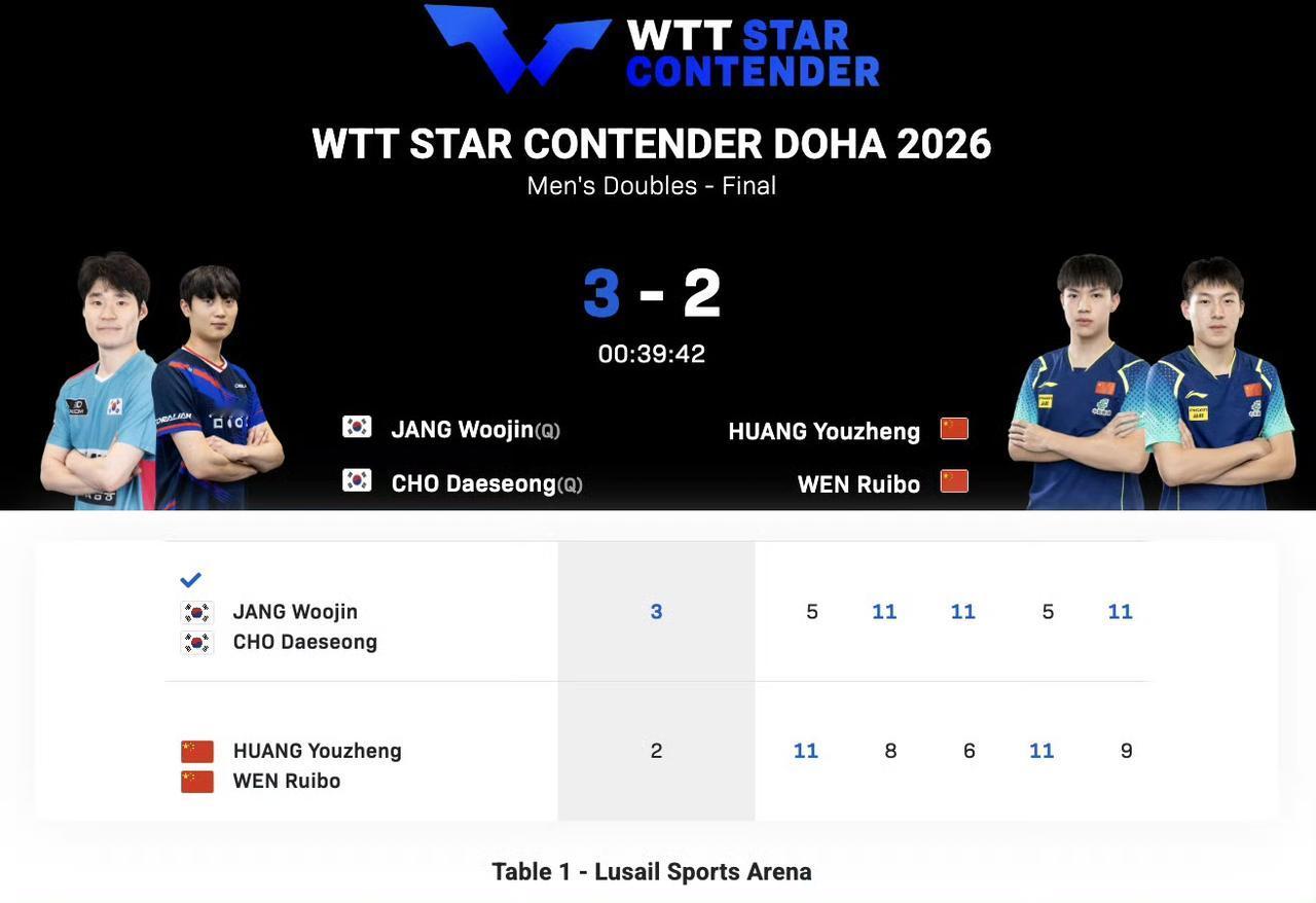 日韩选手夺得男女双打冠军! 1月18日凌晨,2026WTT多哈球星挑战赛结束了男女双打的争夺。 女双,日本组合大藤沙月/横井咲樱3-0佐藤瞳/芝田沙季,获得WTT球星挑战赛多哈站女双冠军。 男双,黄友政/温瑞博2-3张禹珍/赵大成,后者获得WTT球星挑战赛多哈站男双冠军。