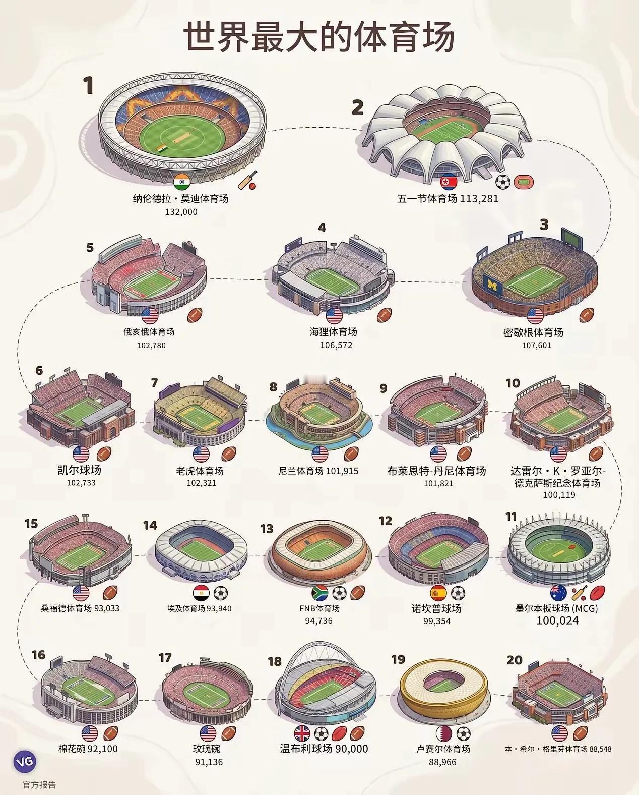 全球最大的体育场馆都有哪些? 太不可思议了! 朝鲜体育馆五一馆竞选第二名了,在别的地方看到的信息是可容纳十五万人左右。 这这个方面看出来中国不是在哪一处都要争取最大的啊!够用就行。以上仅供参考,属个人意见!
