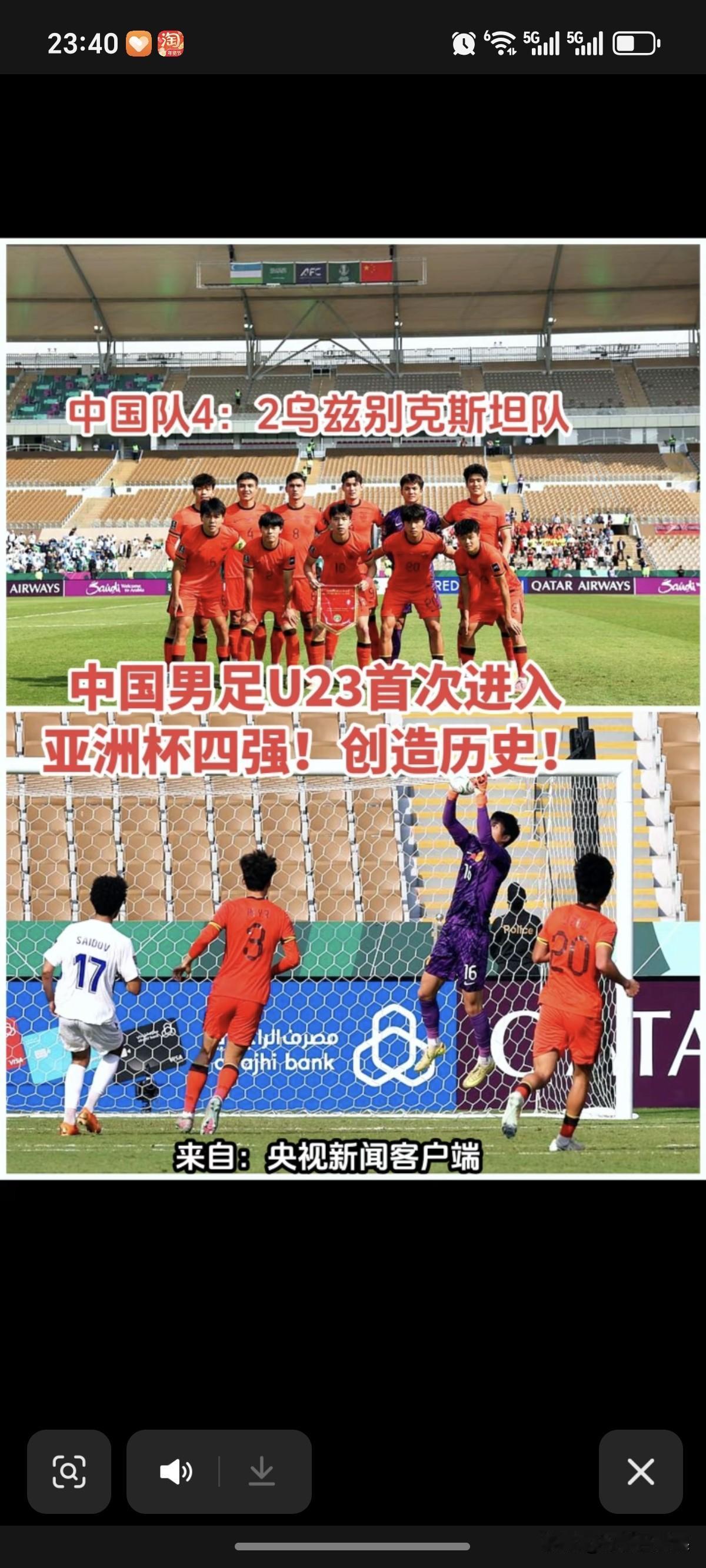 熬夜看球值了!U23男足创造历史,这才是国足该有的样子! U23亚洲杯1/4决赛,我们4:2赢了乌兹别克斯坦,首次挺进四强! 看球的时候全程攥紧拳头,从落后到扳平再到反超,这群年轻的小伙子们用拼劲告诉所有人:我们能行!当终场哨响的那一刻,真的忍不住泪目了。 这才是我们想看到的中国足球!不放弃、不服输,把每一场都当成决赛来踢。 别再用老眼光看他们了,这届U23值得所有掌声! 从落后到逆转,从防守到反击,今晚的中国小伙子们配得上所有赞美。这不仅是一场胜利,更是中国足球新生代的宣言:我们能赢,我们能创造奇迹! 这一刻,所有熬夜看球的球迷都值了。期待他们在半决赛继续带来惊喜!