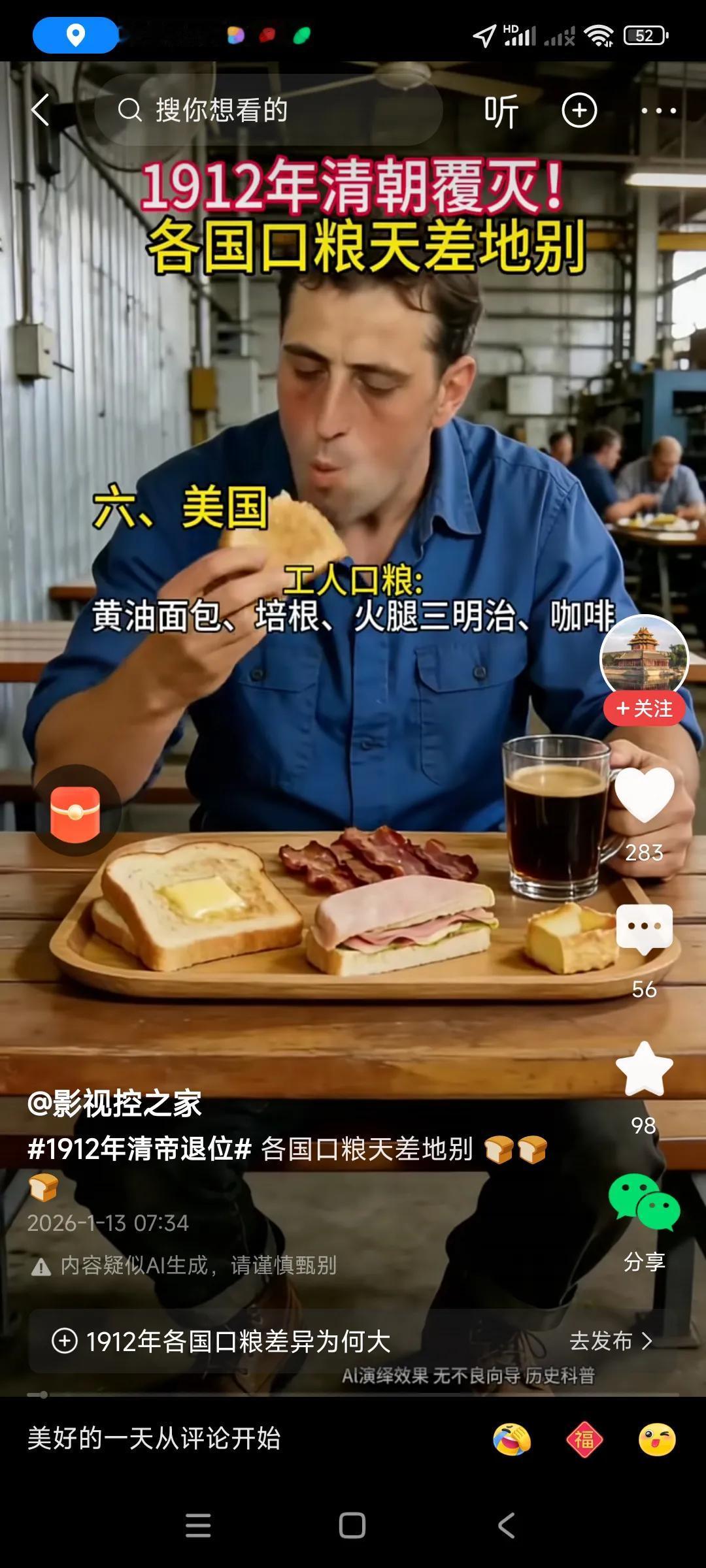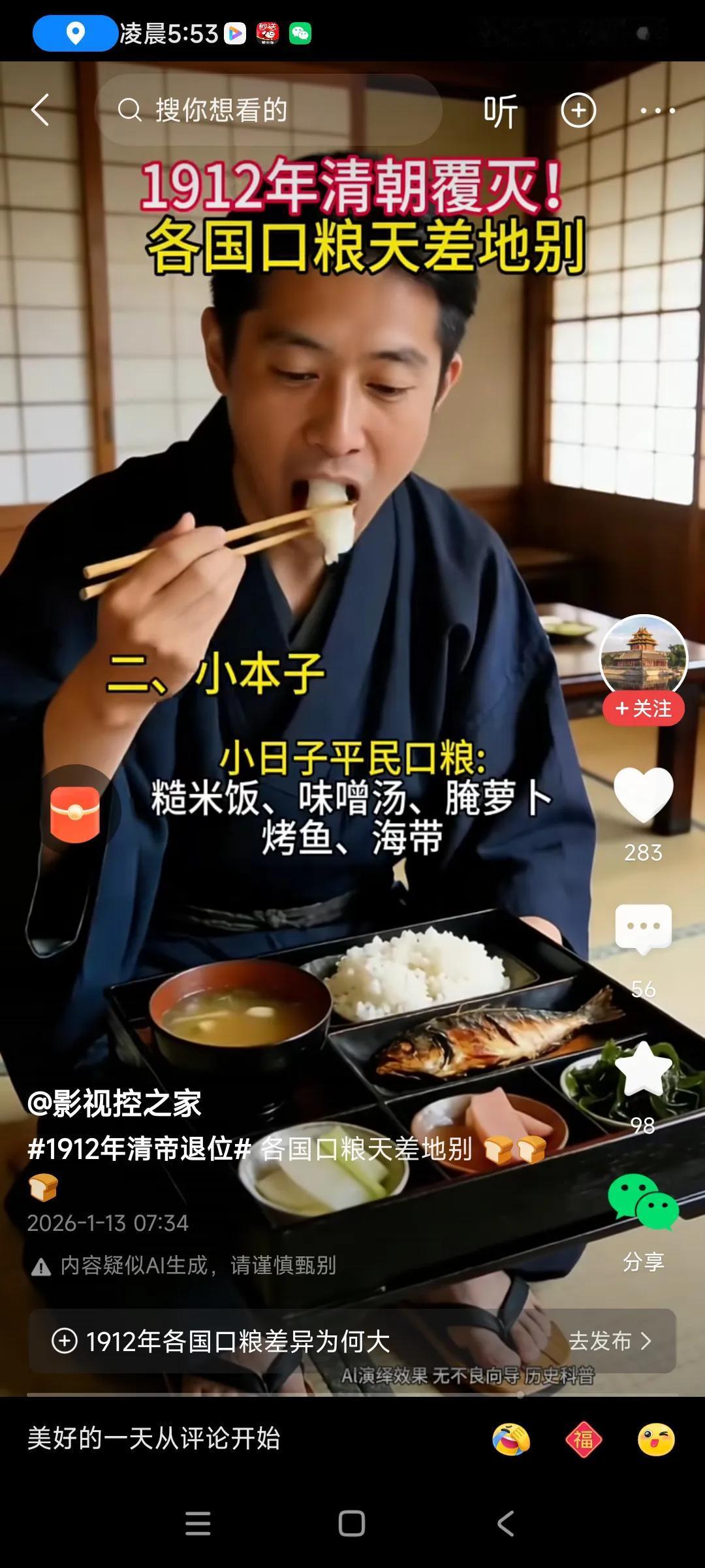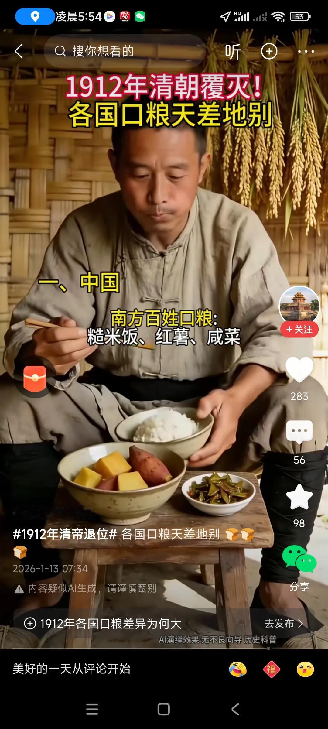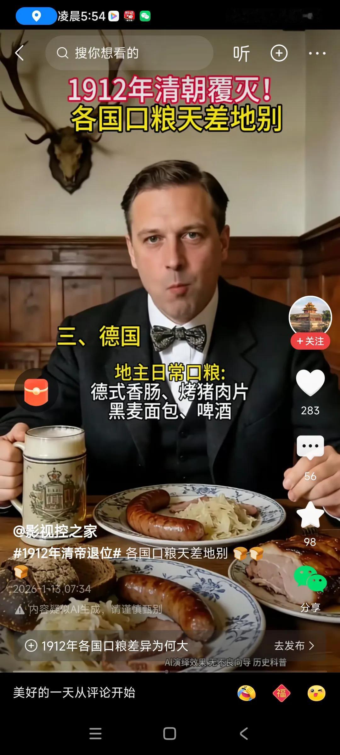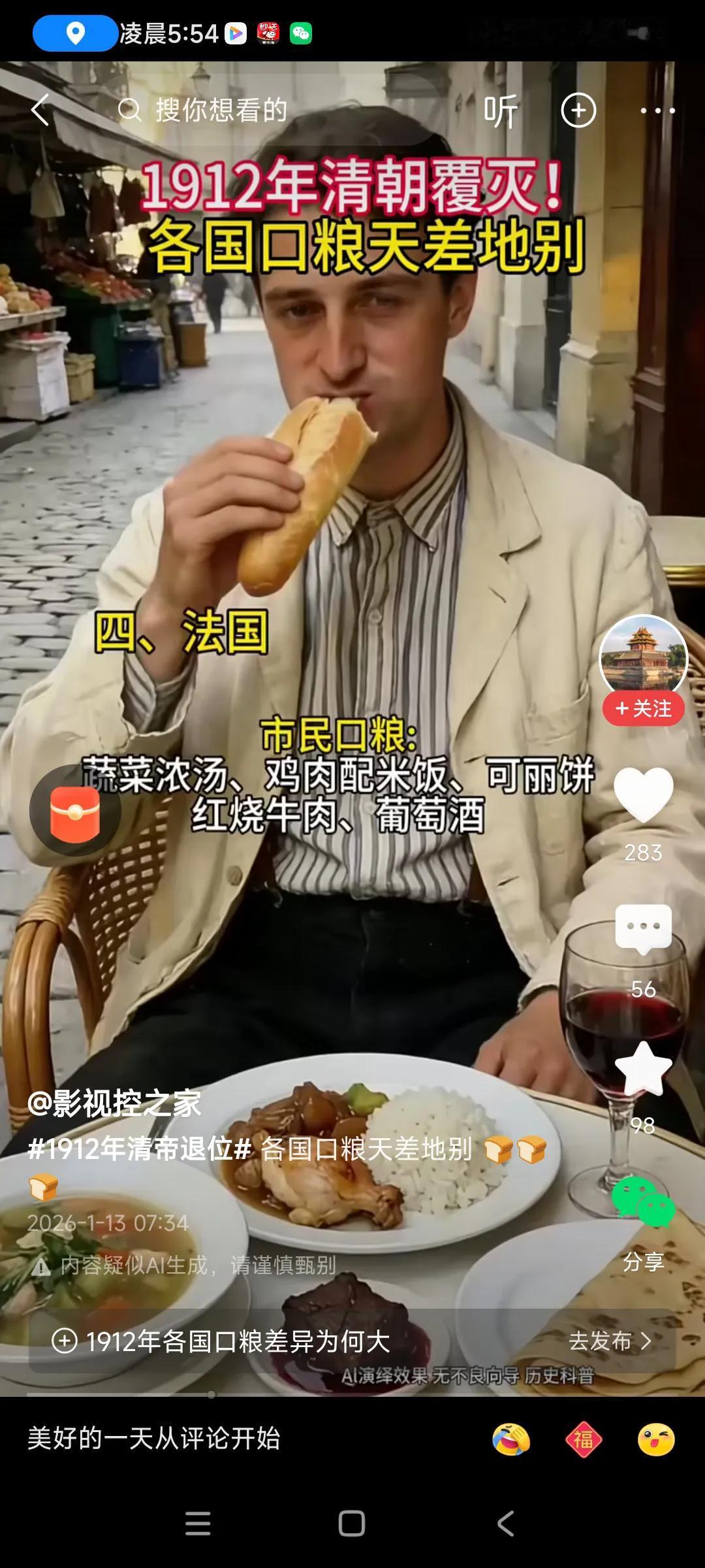 转发网友的,虽丝是AI的,但可能是真的,, 现在是2026年,离1912年,有一百多年了,像欧洲发达国家,美国人,一百年前吃的食物丰盛,营养丰富,非常富裕了,,, 小日本当时吃的,比我们好,又比欧美差了不少,所以老想侵略我们,[捂脸][捂脸,,但是像英国,法国,美国当时生活条件己远远领先我们,比我现在吃得都好,,[捂脸][捂脸] 我一天的伙食是这样的,, 早餐,三个包子,一个豆浆, 午餐,烧鸭饭,七八块鸭肉,几片青菜, 晚餐,猪脚饭,七八块猪肉,一点酸素,