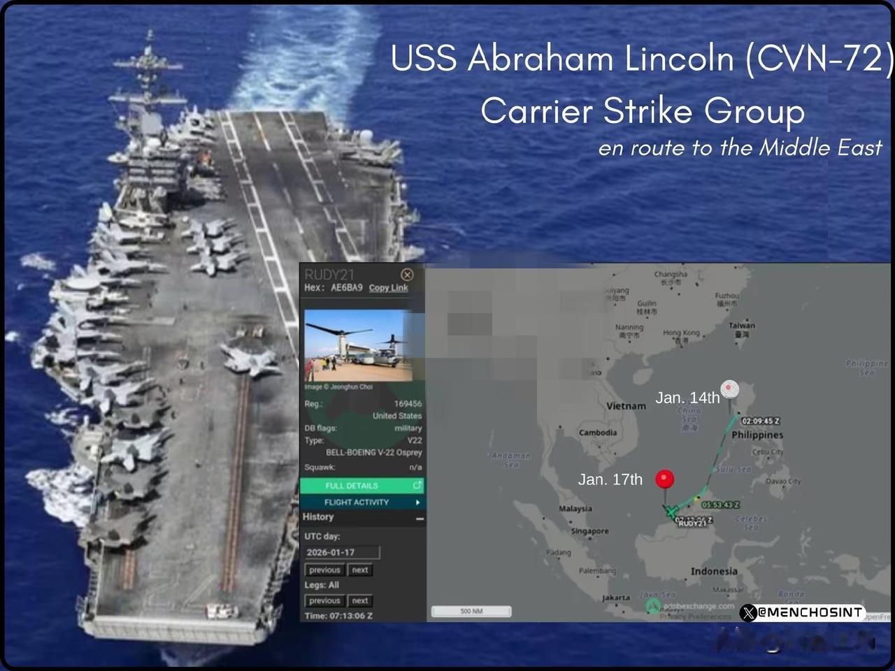 【F35集结琉球?】 1月16号特朗普突然叫停对伊朗的最后打击命令,看来另有隐情? 人们总是在猜测特朗普下一个目标是谁?古巴,格兰特,甚至有人说冰岛? 然而最新消息却是F35云集琉球,美一艘航母依旧在南海游弋,一架美军鱼鹰旋翼机降落到林肯号航母甲板上,位置靠近马来西亚沙捞越,沙巴地区。 这架美军鱼鹰旋翼机是在1月16日,从美军在日本的基地起飞,然后途径琉球群岛的基地。 看来特朗普是想在南海有所动作?
