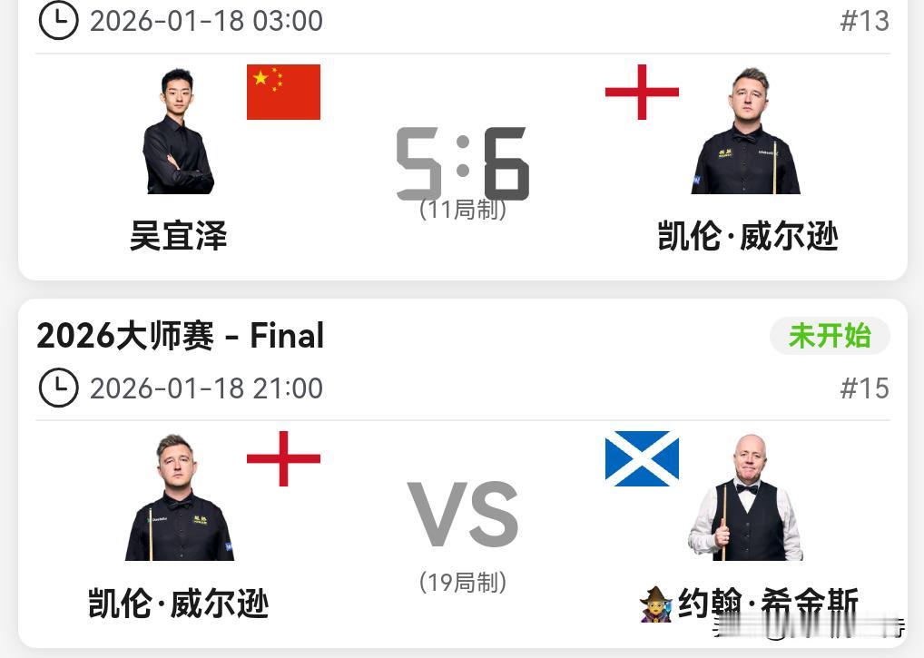 大师赛,吴宜泽惜败,无缘决赛。不过也是表现不错,把凯伦威尔逊吓出一身冷汗。 前面几局,简单失误比较多,凯伦威尔逊4-2领先,随后吴宜泽打出连续单杆,连追单局,5-4率先拿到赛点。 第10局,非常遗憾,吴宜泽错失绝杀对手的好机会。一颗红球简单直球,没有打进。陷入防守,被凯伦上手逆转比分,进入决胜局。 最后一局,吴宜泽防守失位,凯伦威尔逊一杆清台结束比赛。 赛后数据,凯伦也是都占优势,两人的长台都表现的不是很好。 留有遗憾,才有更大的进步空间。虽然这一次吴宜泽止步四强,但是他的进步还是有目共睹,加油少年!