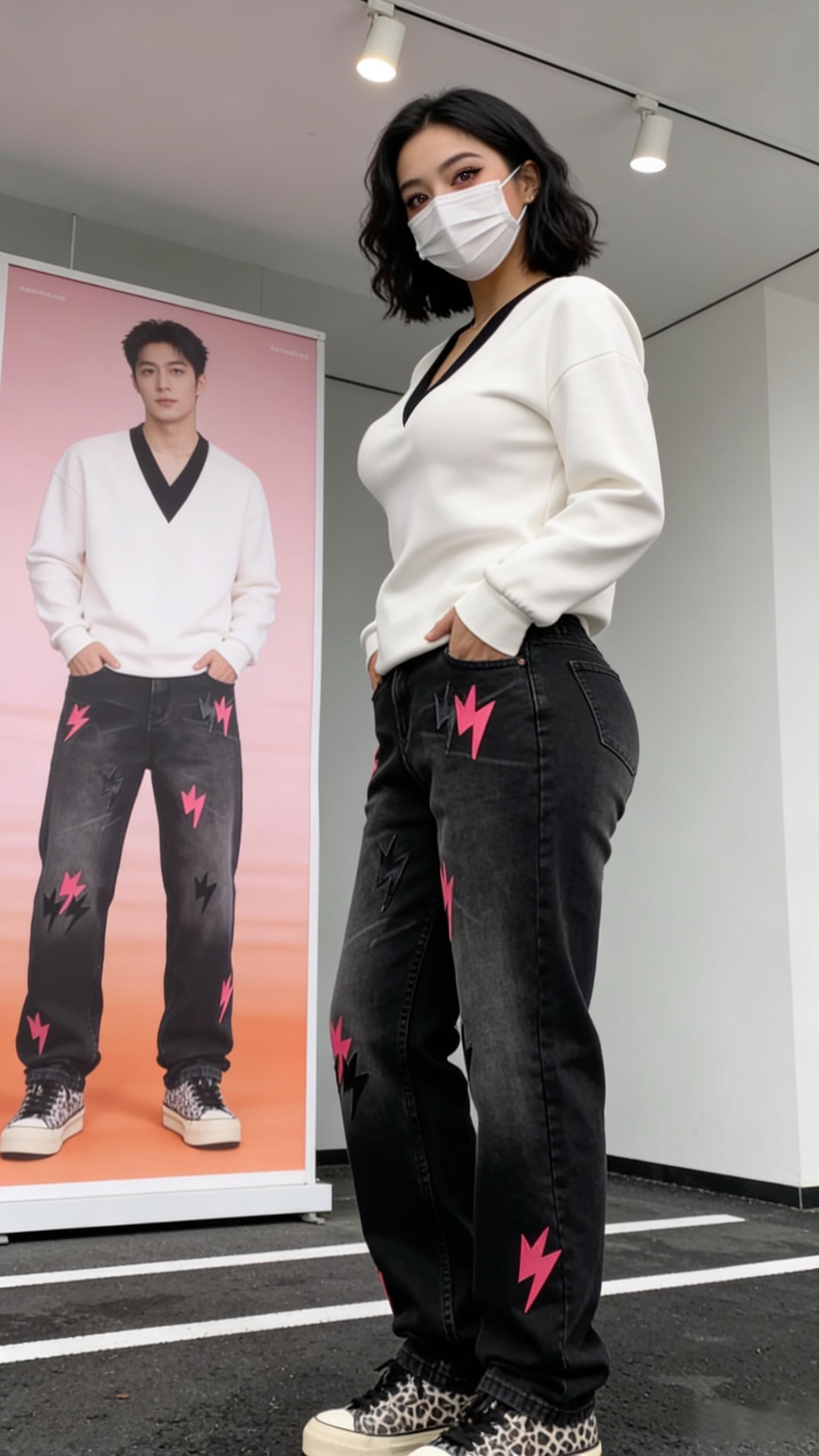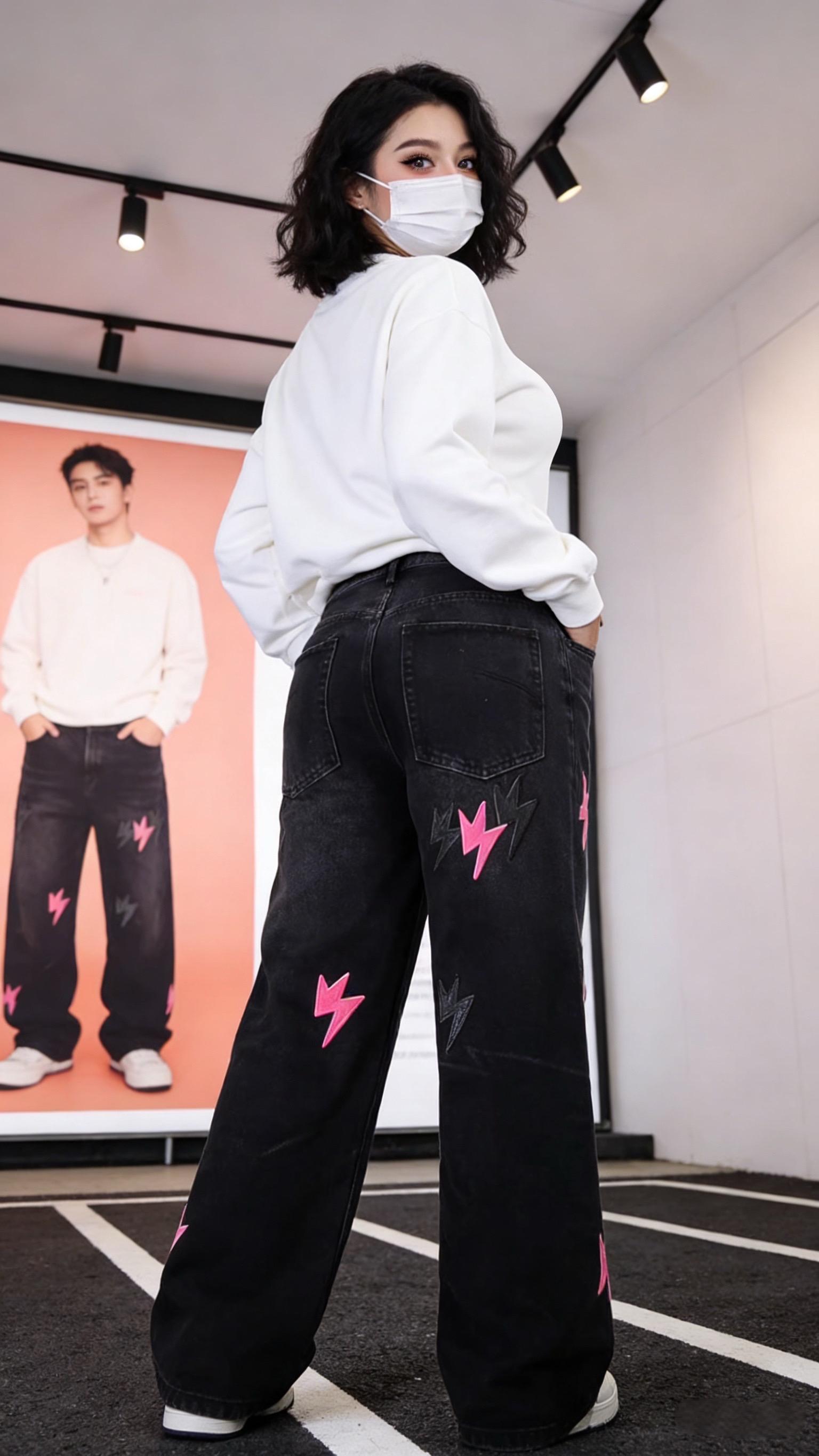 老白同款黑粉拼皮新款高端限定美式潮牌小众男潮流宽松直筒牛仔裤