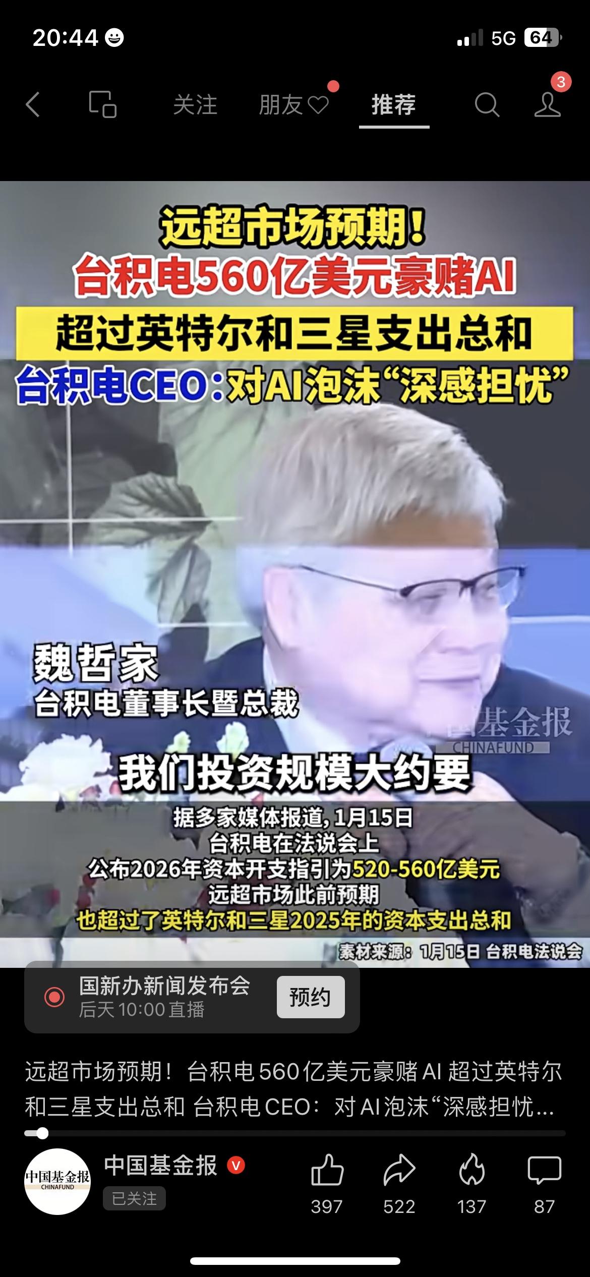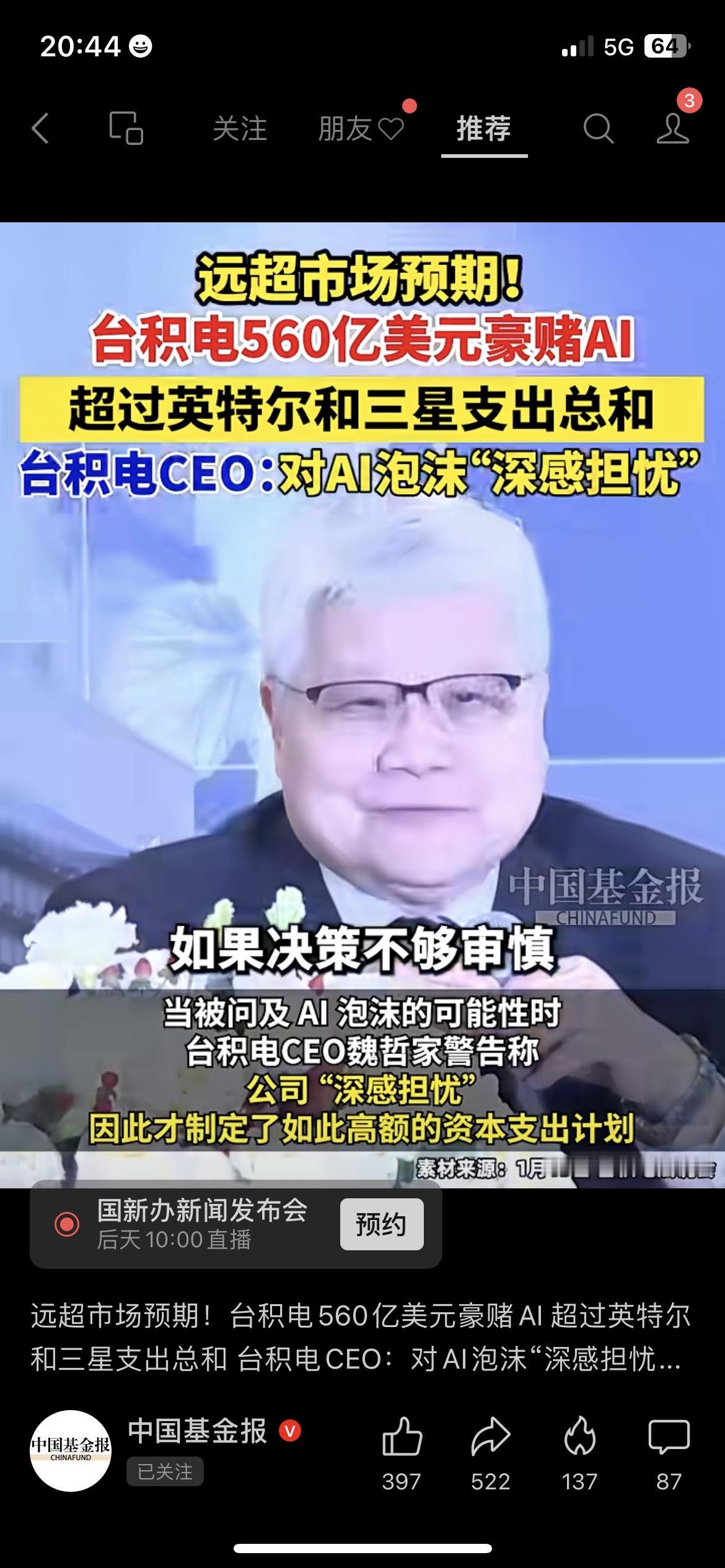 台积电砸560亿美元豪赌AI,超英特尔三星总和 远超预期!台积电斥560亿美元押注AI,这一金额直接超过英特尔和三星的支出总和。但CEO魏哲家却对AI泡沫深感担忧,直言如果不够谨慎,对台积电将是一场灾难。 金句:一边豪赌,一边警惕泡沫,台积电的AI双面镜。 你认为AI泡沫会破裂吗? 台积电 AI 半导体