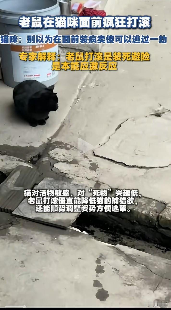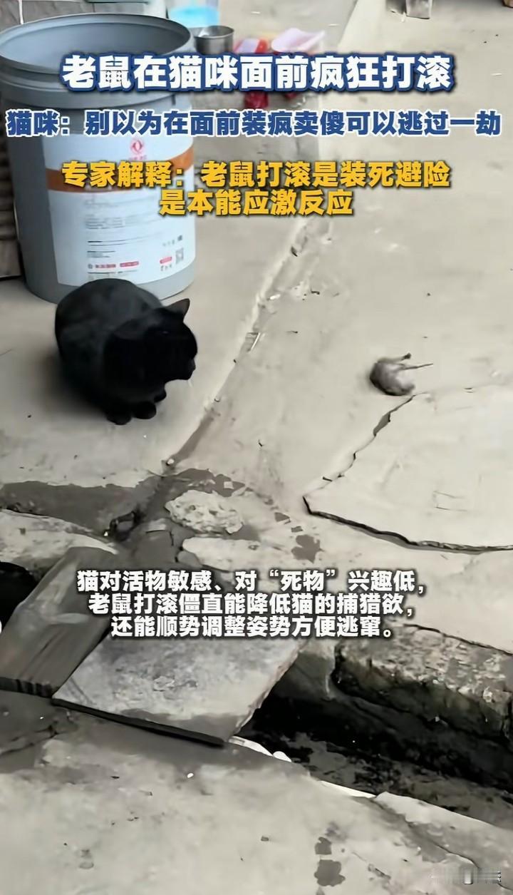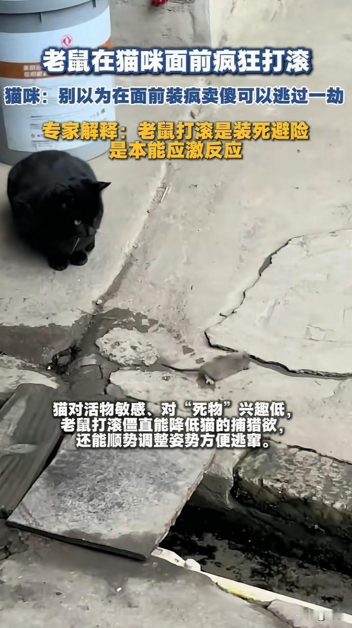 一老鼠在猫咪面前疯狂打滚,大家都知道猫捉老鼠,猫和老鼠是天敌,老鼠在猫面前打滚也是少见。猫对打滚的老鼠目不转睛的盯着,估计老鼠已经慌得一批了。 有专家称老鼠装疯卖傻是本能应激反应,滚到合适的地方,方便逃跑。 猫逮住老鼠一般不会一下子就吃掉,而是逗着玩,等老鼠心如死灰后,才吃掉。 你们怎么看老鼠的行为呢?