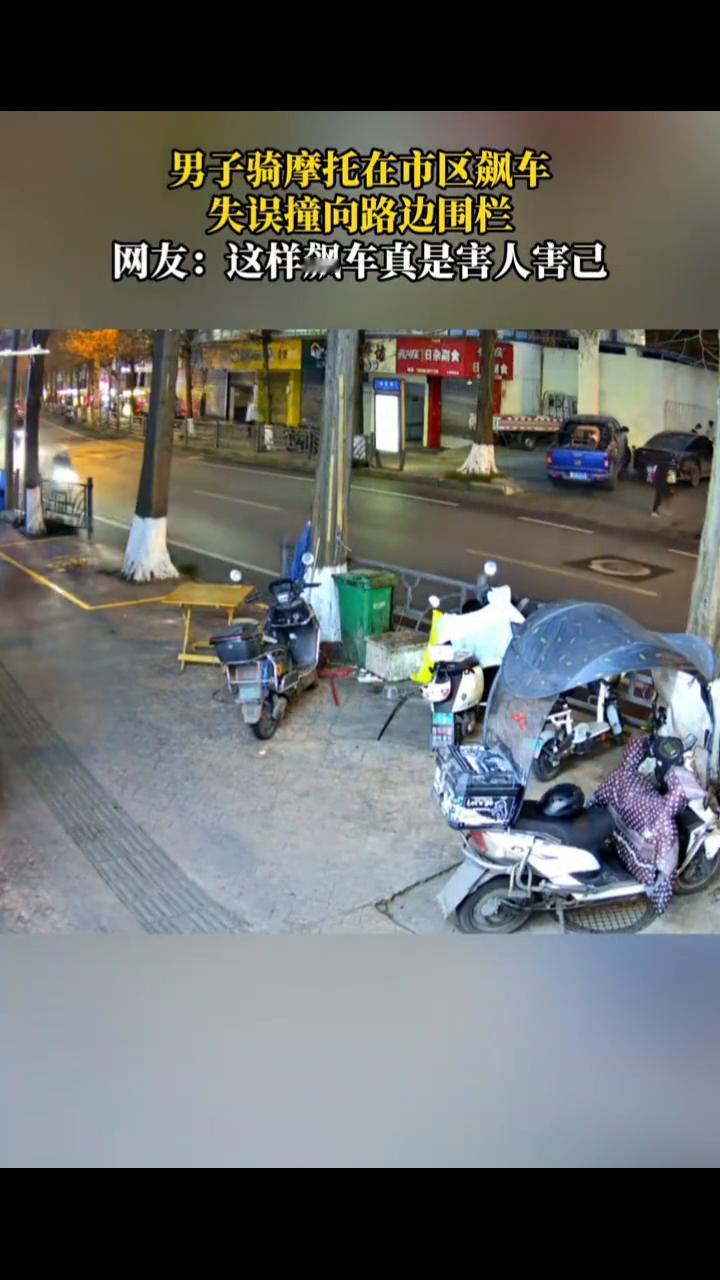 男子骑摩托在市区飙车,失误撞向路边围栏。 网友:这样飙车真是害人害己。 1月16日(发布)。
