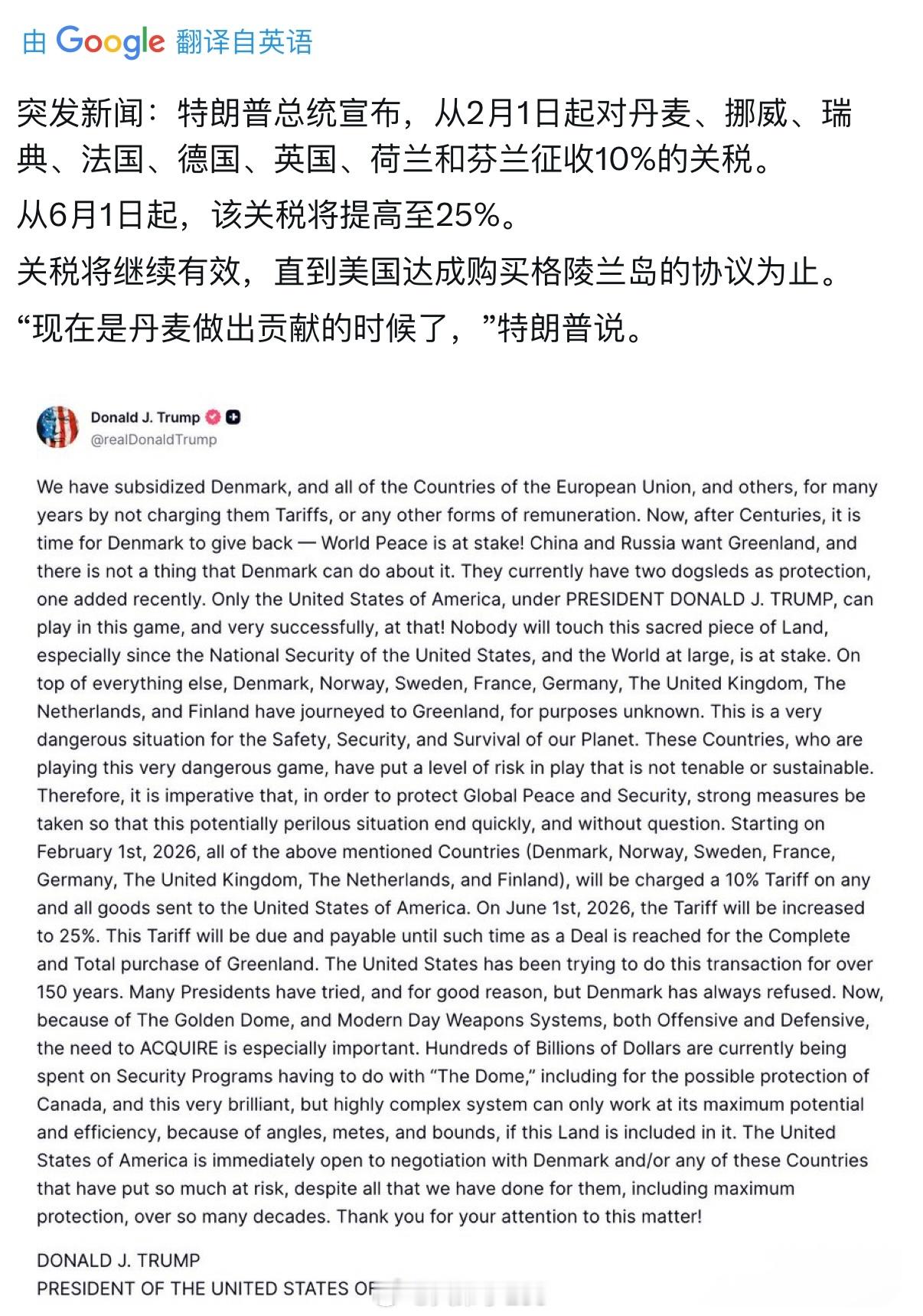 特朗普再次发出中俄威胁论,宣布从2月1日起对丹麦、挪威、瑞典、法国、德国、英国、荷兰和芬兰征收10%的关税,6月1日起,该关税将提高至25%,直到美国达成购买格陵兰岛的协议为止。特朗普因格陵兰岛向欧洲8国加税