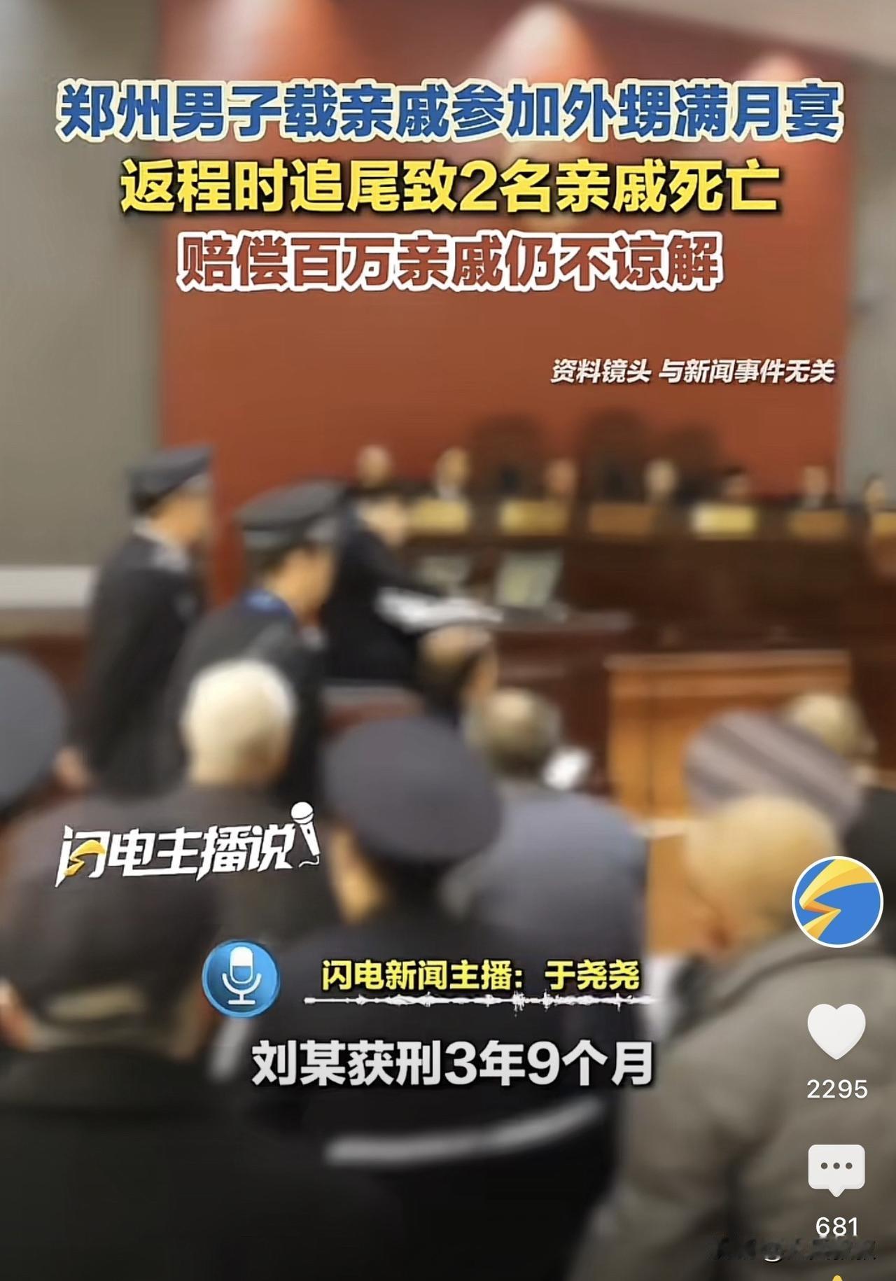 河南郑州,一男子参加外甥的满月宴,吃饱喝足后,男子载着三名亲戚返程,万万没想到,路上却高速追尾了一辆正常行驶的车子,男子虽无大碍,但是坐在后座上的两名亲戚却不幸身亡,即便男子事后支付了丧葬费,可是亲戚的家属还是不予谅解男子,理由是毁了两个家庭,怎么可能会谅解? 去年5月的一天,男子刘某参加完了外甥的满月宴后,就载着三名亲戚一起回程了。因为劳累加上开车分心,刘某的车子直接追尾了一辆正常行驶的车子。 因为车速过快,后排的三名亲戚有两名不幸身亡,因为撞击角度等问题,刘某幸运的活了下来。 虽然活了下来,但是两名亲戚的去世,让刘某还是摊上了事,因为刘某的行为涉嫌交通肇事罪,因此警方则按照犯罪予以了立案。 期间,刘某一方给另外两名去世的家属支付了丧葬费,保险公司也是赔偿了两名家属各60万元,但是,去世亲戚的家属就是不予谅解刘某,理由就是一个疏忽毁了我们两个家庭,这口气实在是咽不下去。 最终,法院因刘某的行为属于好意同乘,减免了刘某20%的赔偿责任,但还是被处以了3年9个月的刑期,刘某对此也是满腹委屈提起了上诉。 事发后,有网友提出,因为你有车,还有几个空座位,你说你接不接,不接的话,人家会说你连亲戚都不认,说的骂的难听,你接吧,一旦出了事,人家又翻脸不认人了,进退两难。 还有网友表示,这是保险公司赔偿的60万,不是你个人出的,你个人只是出了丧葬费而已,这没多少,你要私下给额外给对方一笔赔偿款,才能换的或者是买来这个谅解书,不是说保险公司赔偿了,你就自然而然的获得了谅解。 也有网友说,这俩亲戚家属过分了,人家好心载着你,出了事还要人家赔偿,怎么想的? 其实,民法典规定的很清楚,非营运机动车发生交通事故造成无偿搭乘人损害,若驾驶人无故意或重大过失,可依法减轻赔偿责任。 一般而言,法院通过责任比例划分平衡善意施惠与安全保障的关系,如驾驶人因一般过失致损,通常酌定减轻40%以下责任;若存在酒驾、闯红灯等重大过失,则不予减免。当然,搭乘人未系安全带等过错也可能成为减轻驾驶人责任的考量因素,综合之下,法院减少了刘某20%的责任。 同样,民事减轻责任,不意味着刑事没有责任,因为刘某导致了两人死亡的后果,已经构成了交通肇事罪。 关于审理交通肇事刑事案件具体应用法律若干问题的解释第四条规定,交通肇事具有下列情形之一的,属于“有其他特别恶劣情节”,处三年以上七年以下有期徒刑:(一)死亡二人以上或者重伤五人以上,负事故全部或者主要责任的; 所以,按照上述的规定,刘某应当在3至7年之间量刑,因为没有获得谅解,刘某获刑3年9个月,其实并没有什么疑问,除非刘某有谅解,这才有可能在三年以下量刑或者是处以缓刑。 因为免费接送亲戚,最后追尾亲戚去世了,自己还要坐近4年的牢,不知道当夜晚来临时,刘某躺在冰冷的牢房中,是否会后悔当时让这些亲戚坐进自己车里。 对此,你对本案有什么看法? —————————— 关注我,带你评析法律热点,关注冷暖人生。 文章原创,抄袭必究