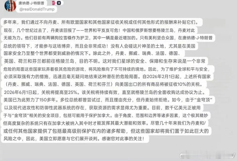 好戏看戏了因格陵兰岛问题,特朗普宣布将对欧洲8国加征关税:自2月1日起对丹麦、挪威、瑞典、法国、德国、英国、荷兰和芬兰加征10%的关税,并于6月1日将关税提高至25%,该关税将持续有效,直至“就格陵兰岛的全面收购达成协议”。