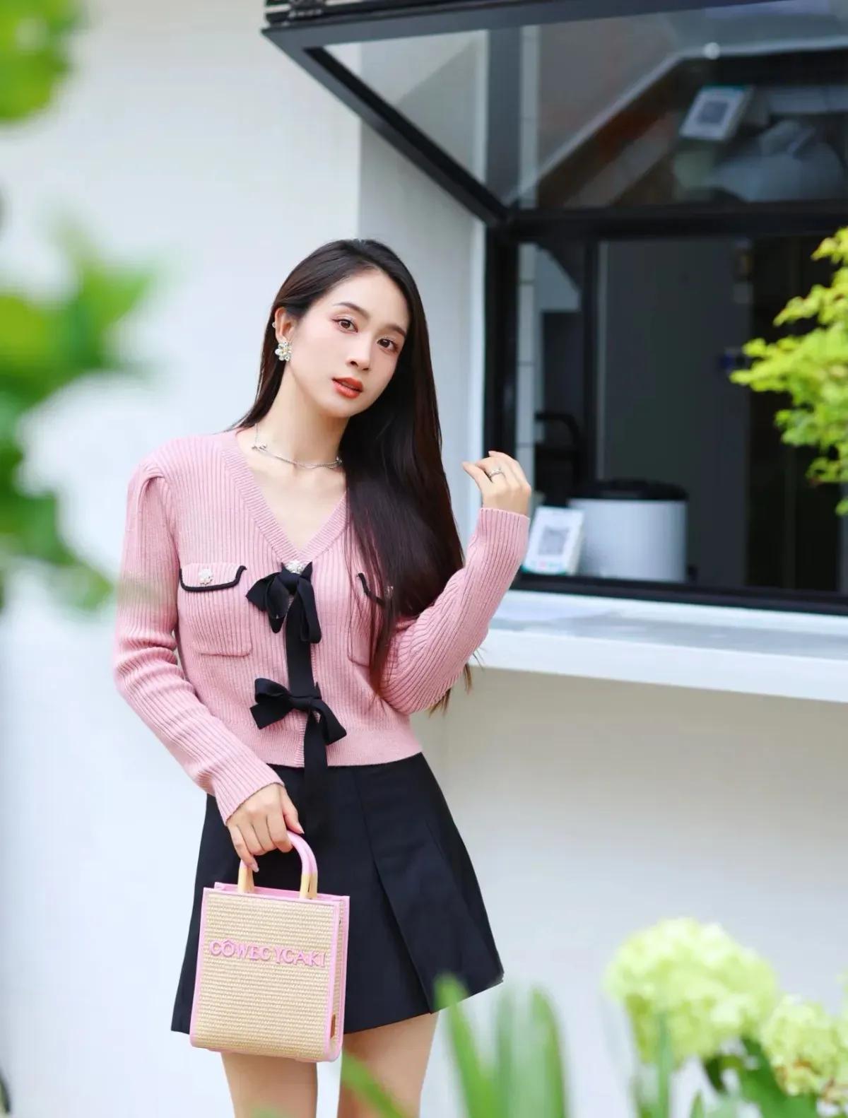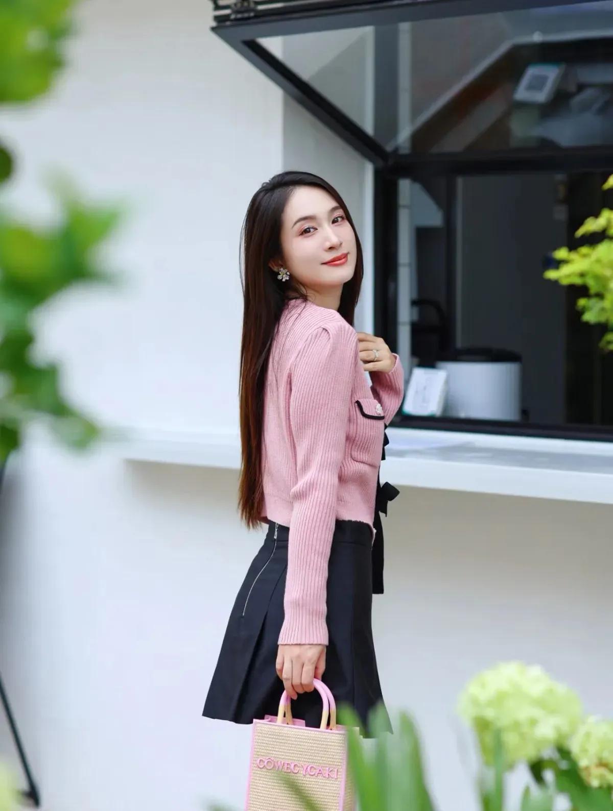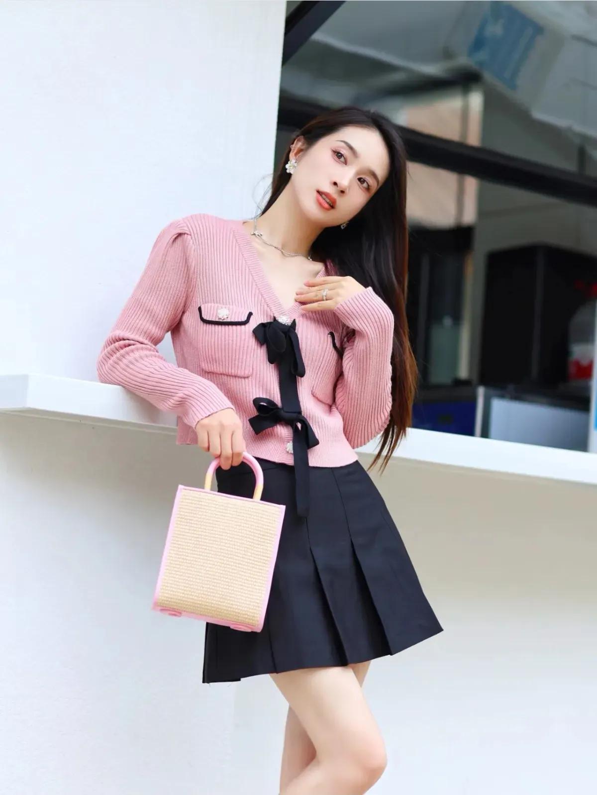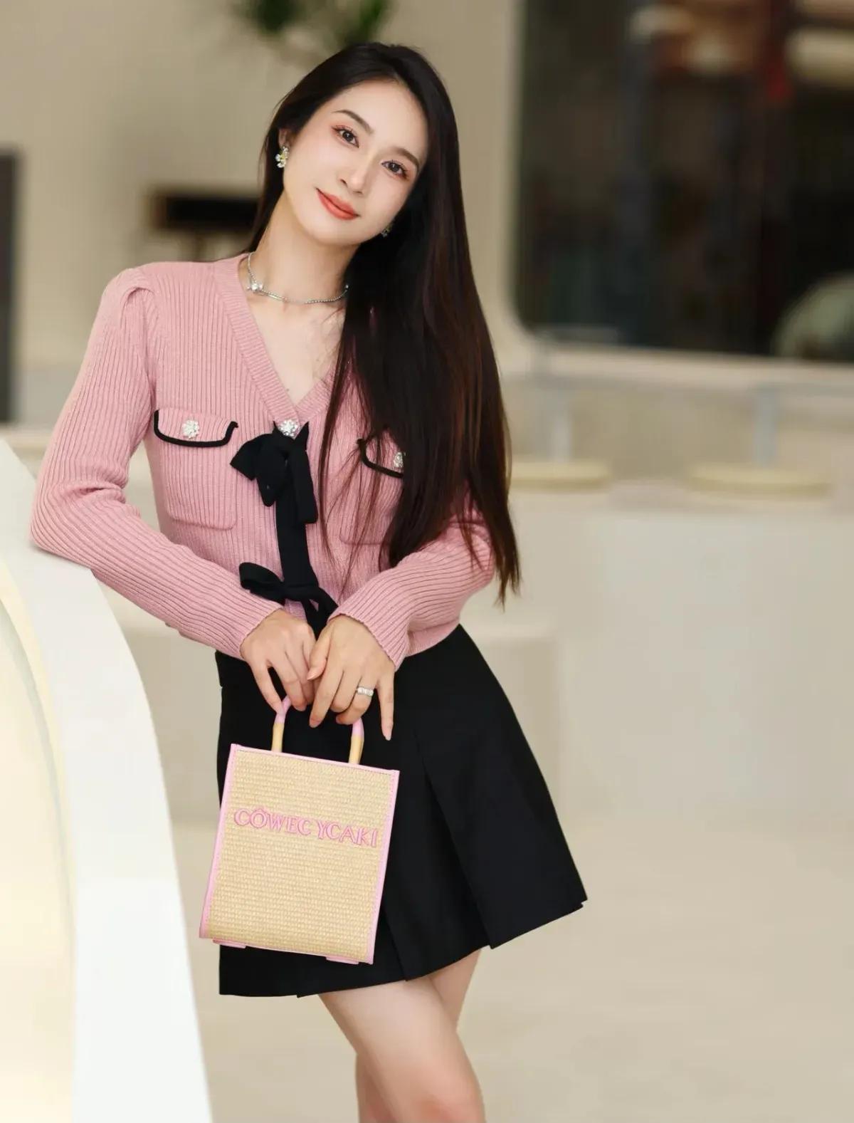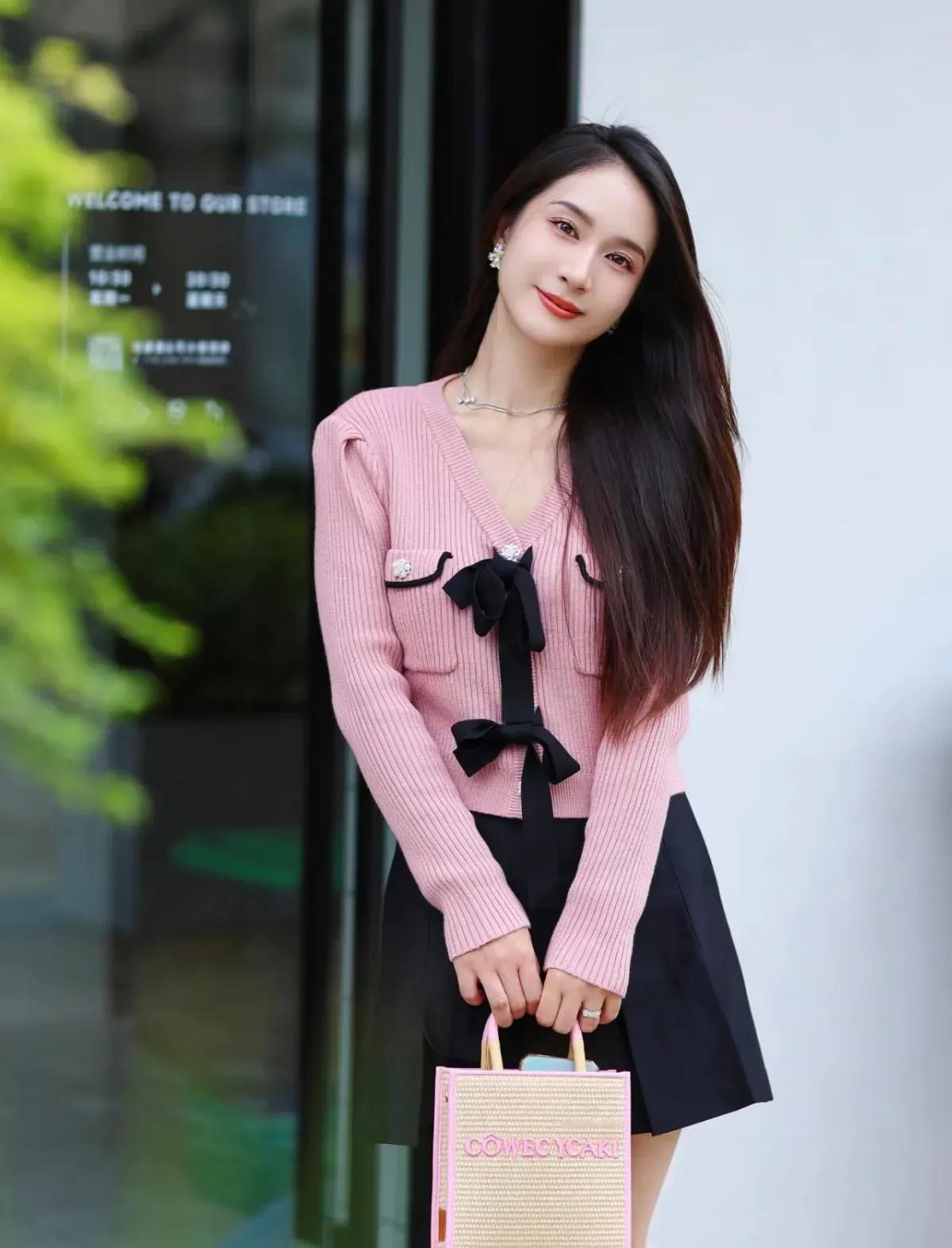 这套穿搭是甜酷优雅的粉黑撞色轻熟风,把少女感和精致细节融合。粉色针织短外套自带甜美元素,黑色蝴蝶结+金属扣添精致轻奢感;搭配黑色短裙,中和粉色的柔和,显利落轻熟,适配清新咖啡馆打卡、轻约会等场合。 粉棕拼色包呼应外套色调,强化甜酷撞色感;黑色凉鞋提升轻熟气场,让造型更显协调。充分展现穿着者甜酷优雅的轻熟魅力。粉色调穿搭 粉黑气质穿搭 怎样穿搭能显示出温柔的女生气质? 通勤穿搭
