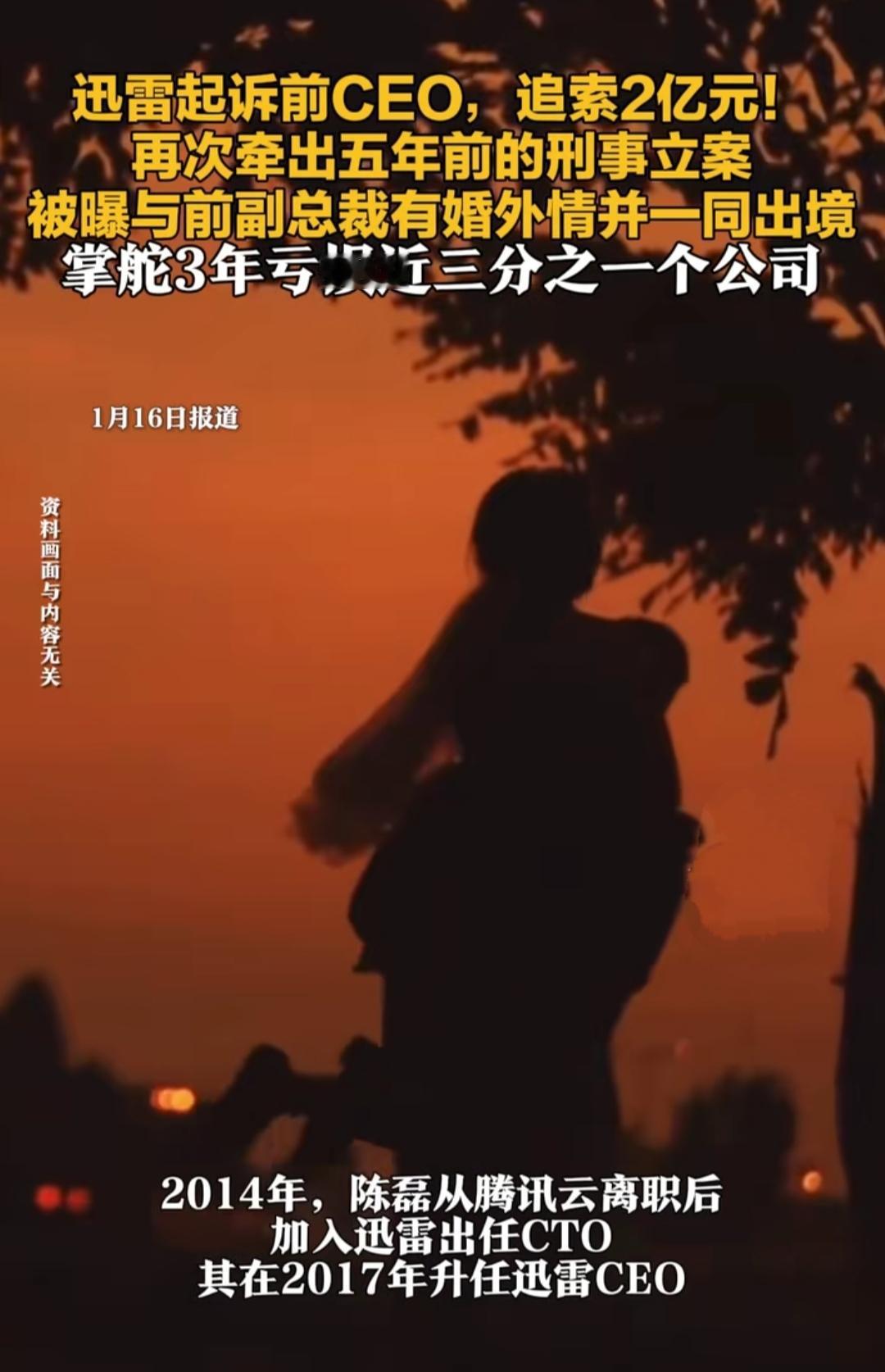 咱平时吃职场瓜顶多是同事拌嘴,这迅雷前CEO的事儿是真给我看懵——据媒体报道,公司刚把他告了,张嘴就要2亿,还牵扯出5年前的旧案,这剧情直接把我cpu干烧了。 陈磊2017年当上迅雷CEO,掌了3年舵,公司亏了近10亿(约三分之一资产),这是公开财务数据里明写的。更受关注的是,他和已婚的女副总董鳕,被曝是公司核心权力层,还传有不正当关系,这些是媒体引述的内部消息。 后来查这事儿,俩人2020年直接出境,陈磊持美国籍滞留境外没配合调查,当年案子只能搁置。现在迅雷把官司摆上台面,这2亿能不能要回、那些爆料是真是假,咱就继续蹲后续吧。