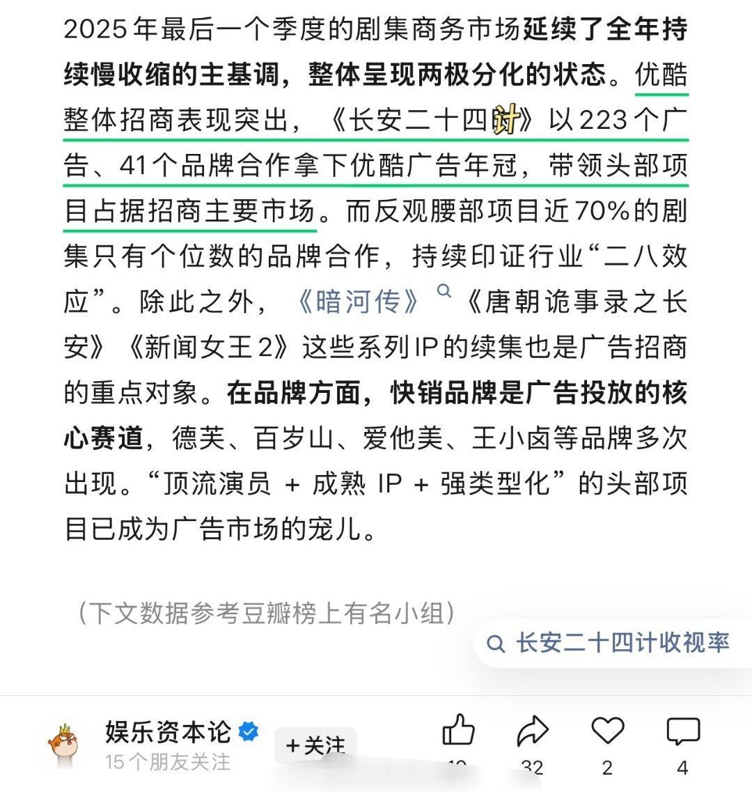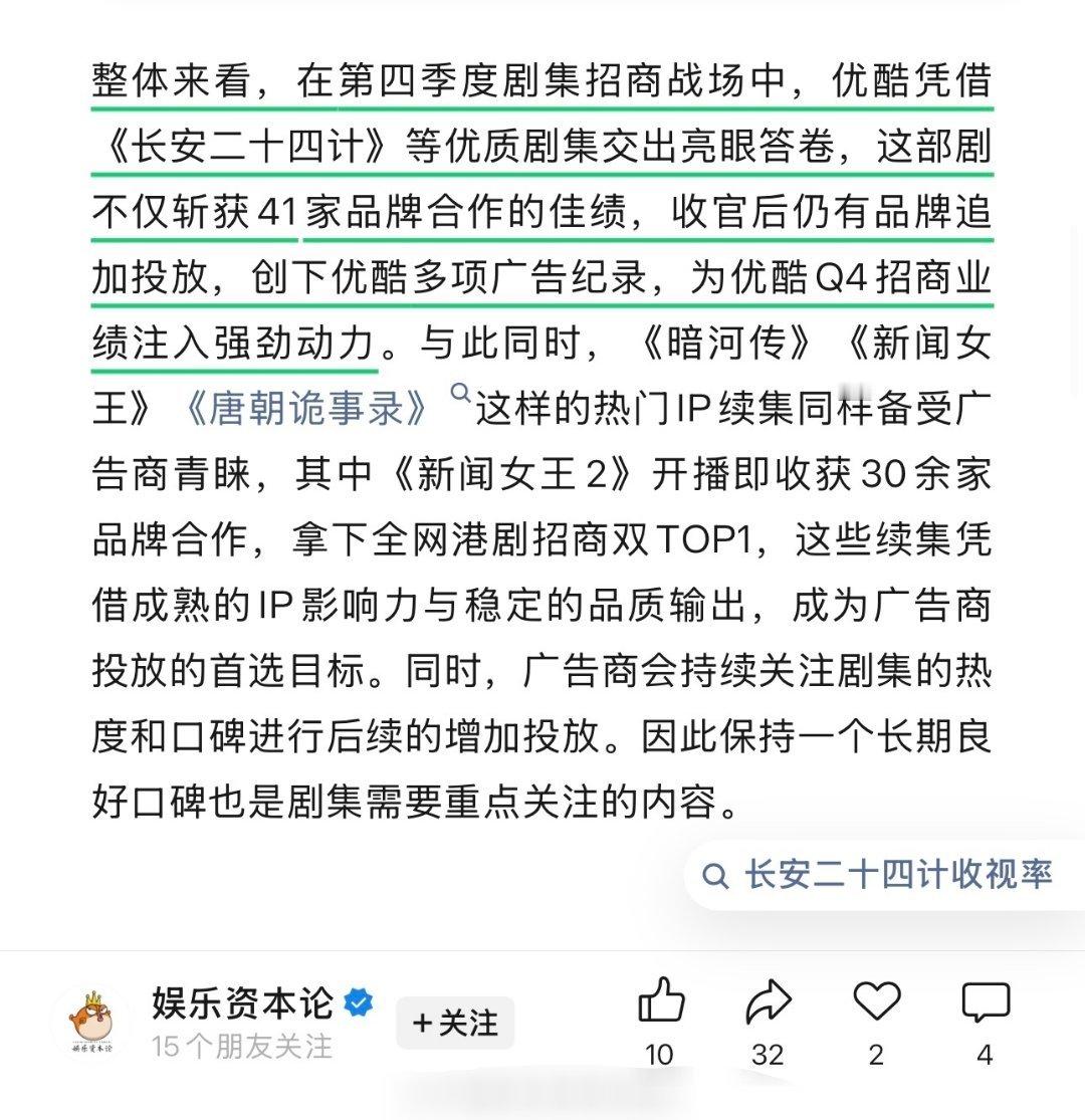 娱乐资本论这个媒体,在娱乐圈的地位很高,不是说它有什么背景,而是数据客观公正,业内都爱看——所以谢谢它发声,认证成毅《长安二十四计》优酷广告年冠 。
