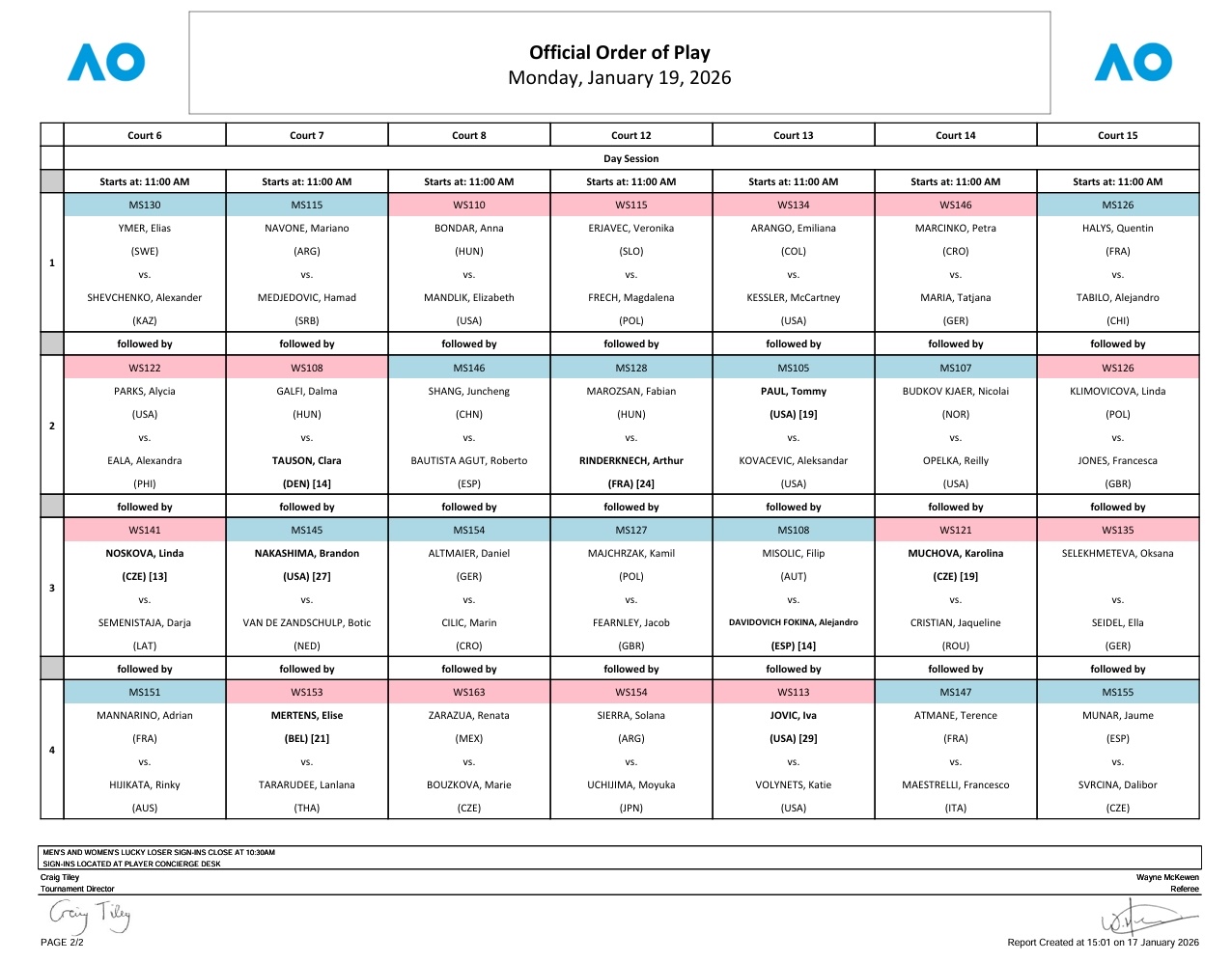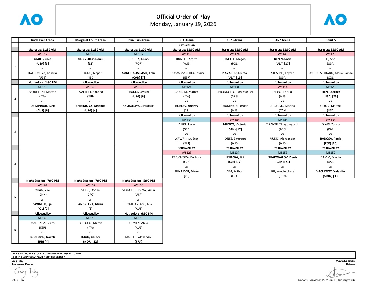 澳网2026 第二日赛程📅澳网首轮继续,袁悦再战斯瓦泰克,高芙、阿尼西莫娃、佩古拉、姆博科等球员亮相,米拉·安德列娃对阵维基奇,克雷吉茨科娃迎战施耐德。具体安排如下,除了前两大球场之外,其他场地都在北京时间8:00开赛👇📍罗德·拉沃尔球场⏰8:30开赛(夜场16:00)第一场:高芙 vs 拉克西莫娃夜场第一场:[Q]袁悦🇨🇳 vs 斯瓦泰克📍玛格丽特·考特球场⏰8:30开赛(夜场16:00)第二场:沃尔特特 vs 阿尼西莫娃夜场第一场:维基奇 vs 米拉·安德列娃📍约翰·凯恩球场⏰8:00开赛(夜场14:00)第二场:佩古拉 vs 扎哈洛娃夜场第一场:[Q]斯塔罗杜布采娃 vs 汤姆贾诺维奇📍起亚球场第一场:[Q]亨特 vs 博萨斯·马内罗第四场:克雷吉茨科娃 vs [23]施耐德📍1573球场第一场:里内特 vs [15]纳瓦罗第三场:[17]姆博科 vs [W]E·琼斯📍ANZ球场第一场:[27]肯宁 vs 斯特恩斯第二场:[W]韩天遇 vs [Q]斯塔库斯奇📍5号球场第一场:李吉妮 vs 奥索里奥第三场:[W]迪亚斯 vs [25]巴多萨📍6号球场第二场:帕克斯 vs 伊埃拉第三场:[13]诺斯科娃 vs 塞门尼斯塔娅📍7号球场第二场:加尔菲 vs [14]陶森第四场:[21]梅尔滕斯 vs [Q]塔拉鲁迪📍8号球场第一场:邦达尔 vs [W]曼德利克第四场:扎拉祖阿 vs 布兹科娃📍12号球场第一场:埃里亚韦茨 vs 弗莱彻第四场:谢拉 vs 内岛萌夏📍13号球场第一场:阿朗戈 vs 凯斯勒第四场:[29]约维奇 vs 沃利内茨📍14号球场第一场:马辛科 vs 玛利亚第三场:[19]穆霍娃 vs 克里斯蒂安📍15号球场第二场:[Q]克里莫维科娃 vs F·琼斯第三场:塞莱赫梅蒂娃 vs 赛德尔
