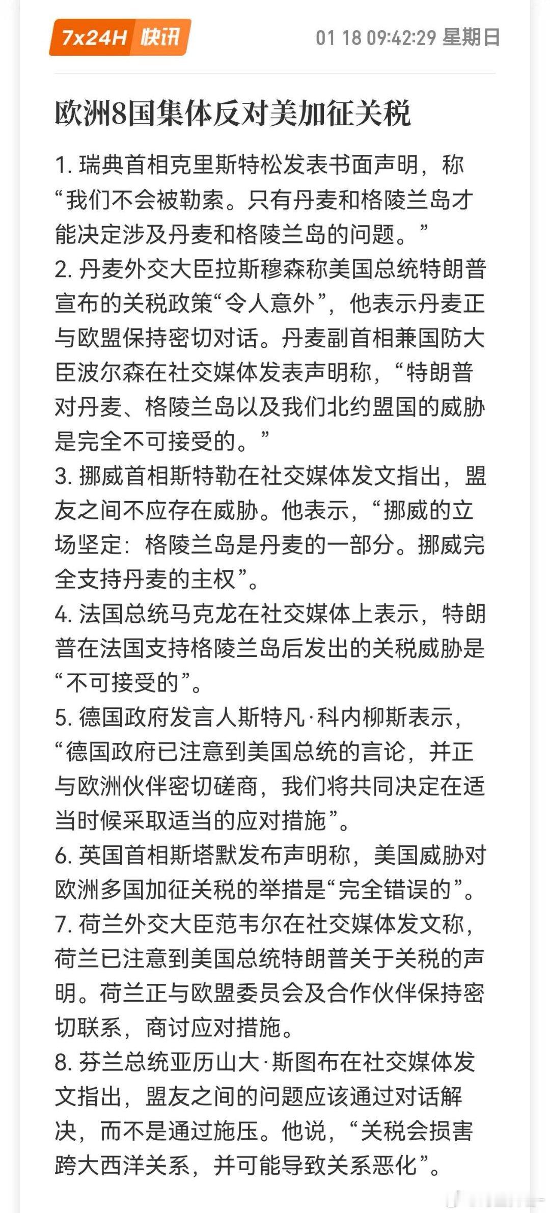 特朗普因格陵兰岛向欧洲8国加税川普宣布对欧洲 8 国加征关税后,各国声明情况。北约的“共同价值与利益”口号在现实利益冲突前显得苍白无力。