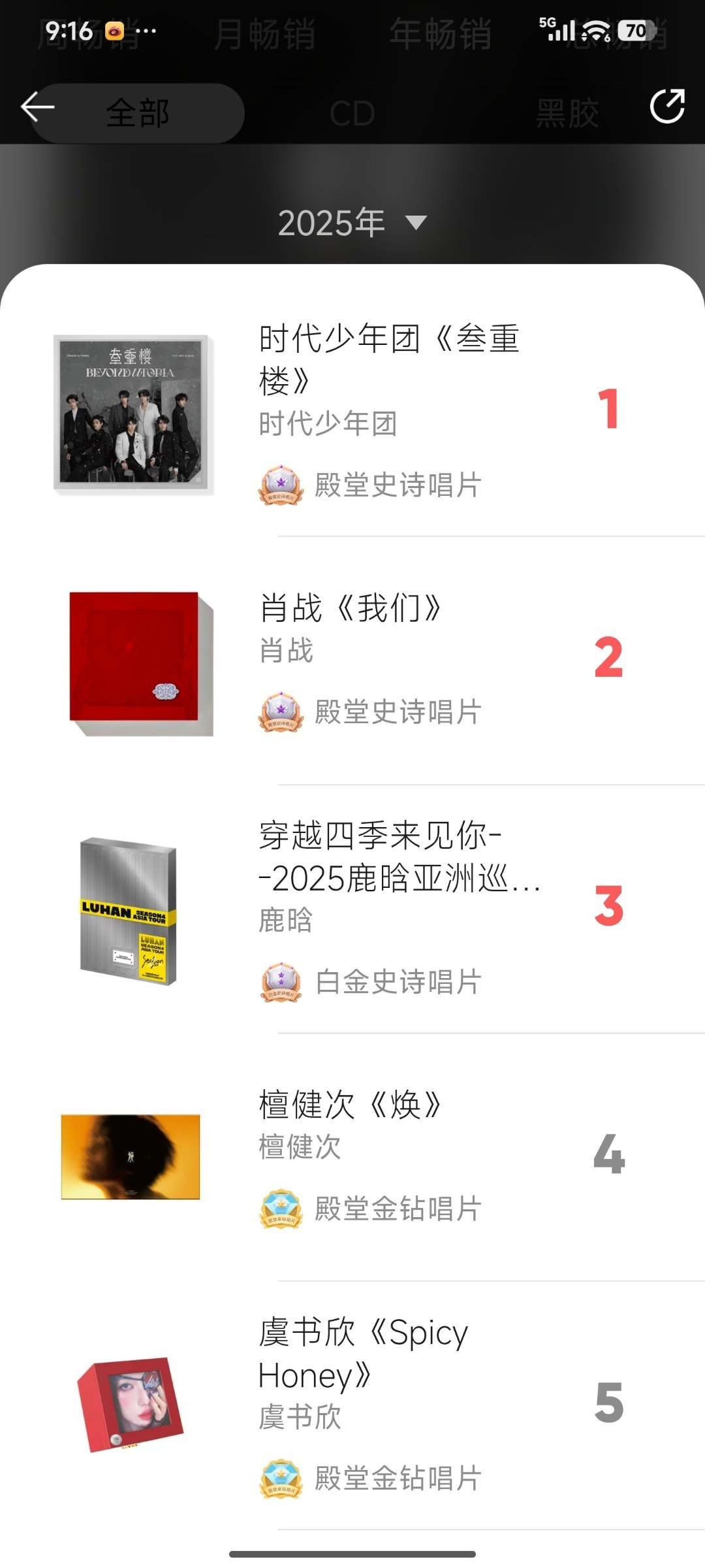 QQ音乐,2025年全年实体专辑销售前五——❶时代少年团(马嘉祺、丁程鑫、宋亚轩、刘耀文、张真源、严浩翔、贺峻霖),专辑《叁重楼》。❷XZ《我们》。❸鹿晗《穿越四季来见你》。❹檀健次《焕》。❺虞书欣《Spicy Honey》。PS:虞书欣竟然是女歌手个人专辑最高的。