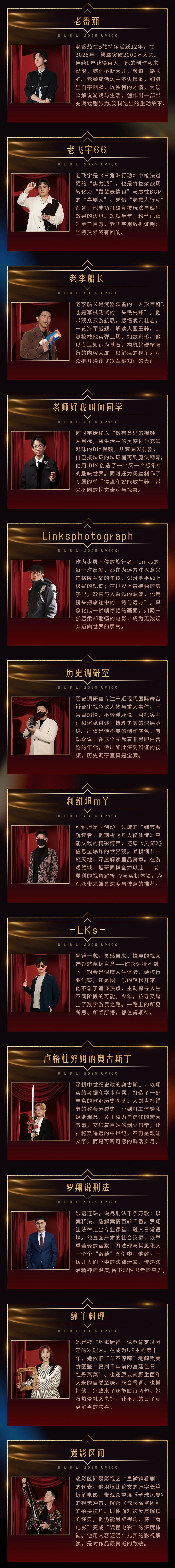 【何同学重新当选百大UP主】罗翔连续六年入选百大UP主 1月18日中午,哔哩哔哩年度百大UP主名单揭晓。这届百大UP主人均创作时长近7年,累计创作超4.9万支视频,作品时长超过99万分钟,总播放量超656亿次。B站表示,2025年百大UP主盛典将从“专业性、影响力、创新性”等维度进行评审,颁发系列奖项。专业性:创作具有高度的专业性,可作为对应内容类型的代表。影响力:本年度重要作品取得过积极、正面、广泛的社区影响力。创新性:突破自我,敢于创新,积极尝试不同的创作方式。值得注意的是从2020年以来,罗翔已经连续6年入选百大UP主;何同学25年重新当选百大up主。骄阳似我庆功宴