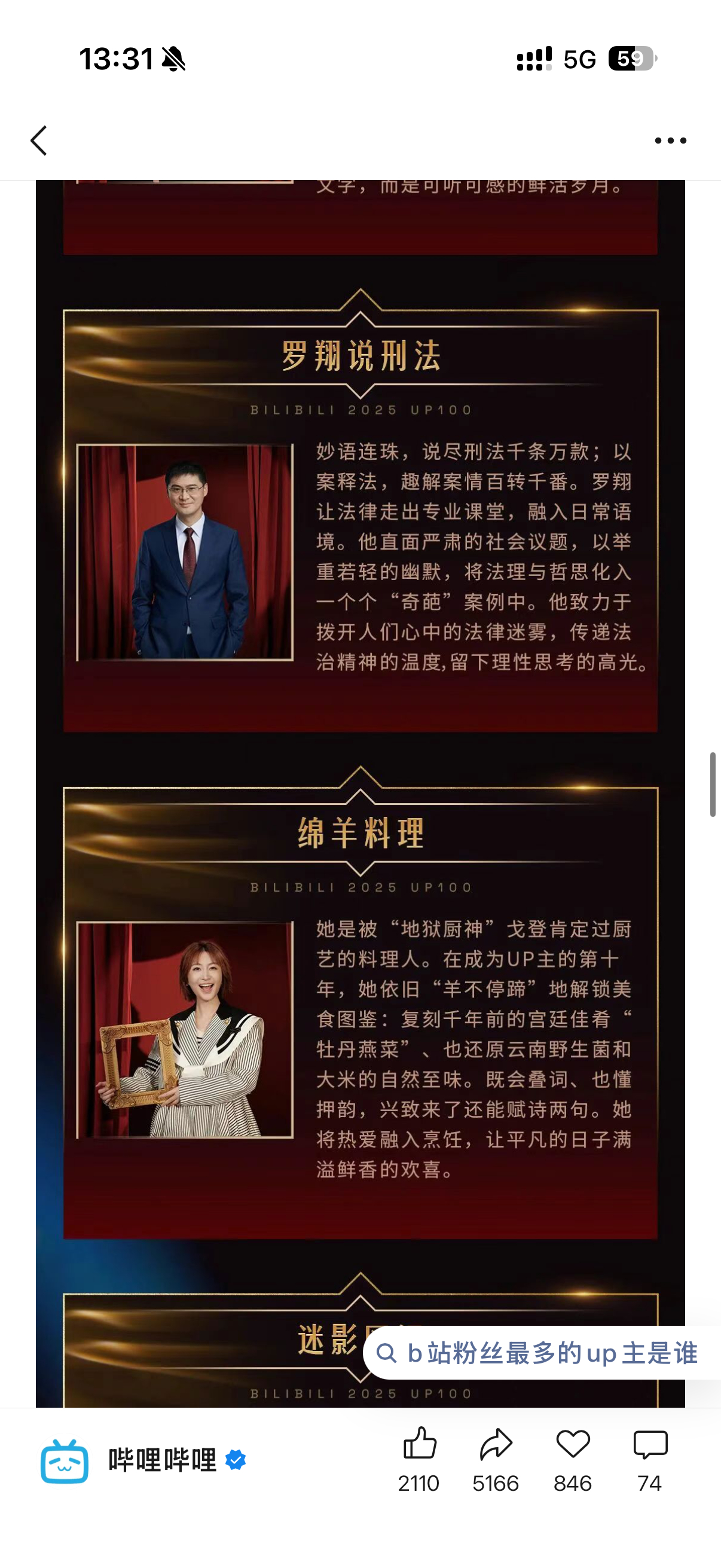 【何同学重新当选百大UP主】罗翔连续六年入选百大UP主1月18日中午,哔哩哔哩