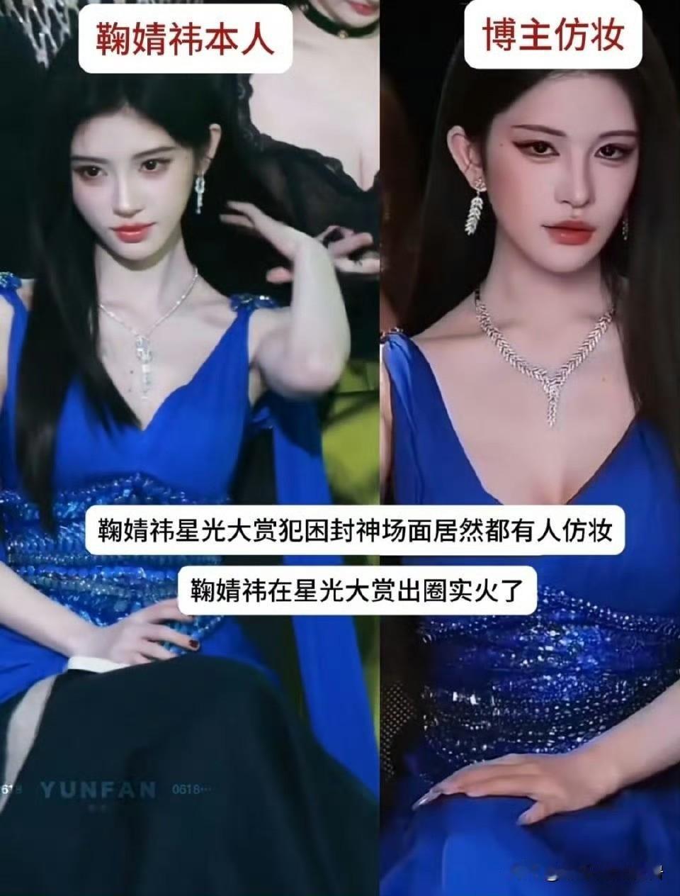 鞠婧祎犯困都有人仿妆了,可见是真的火呀! 鞠婧祎在2025年底星光大赏上因身着深海蓝礼服、面露倦容的瞬间被镜头捕捉,其疲惫却精致的"易碎感"神态意外引爆全网仿妆热潮,成为开年最火美妆模板。 据说鞠婧祎疲惫状态的动图经娱乐账号扩散后,24小时内抖音播放量破300万,"带薪犯困天花板""人间睡美人"等调侃标签迅速刷屏,引得仿妆博主纷纷开始拆解妆容,效仿鞠婧祎,可见“四千年第一美女”的传播力还是在的。 鞠婧祎