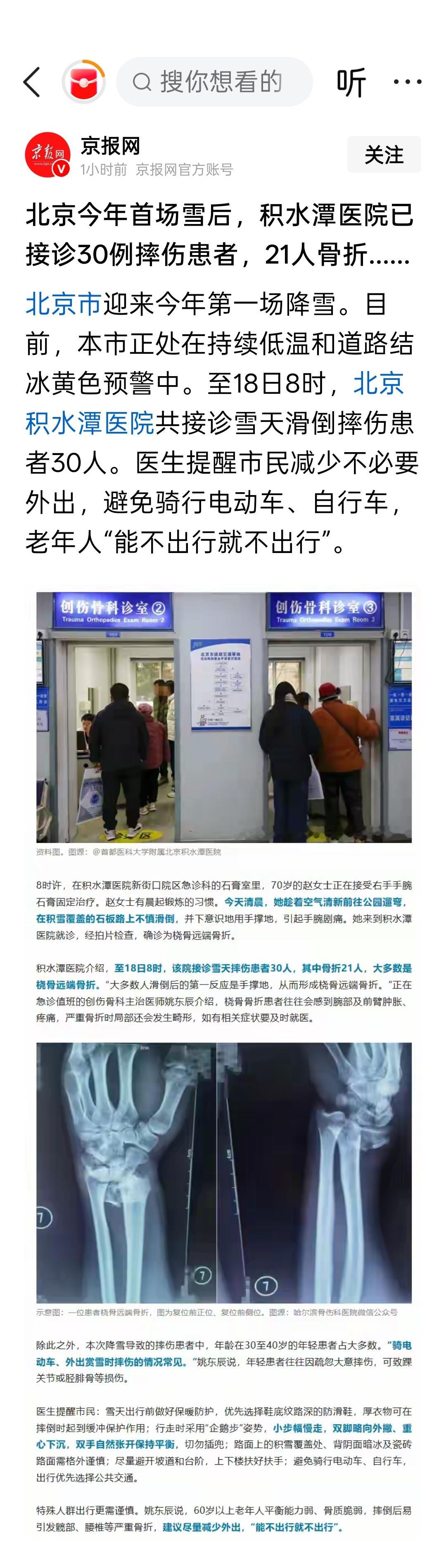 北京今年首场雪后,积水潭医院已接诊30例摔伤患者,21人骨折……