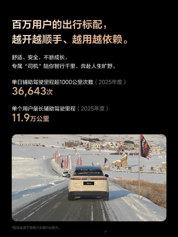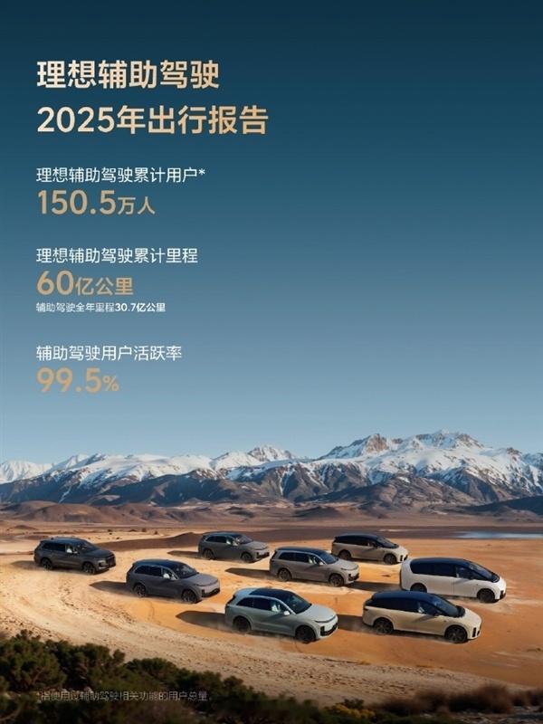 【累计行驶超60亿公里!理想公布2025年辅助驾驶出行报告】今日,理想汽车公布理想辅助驾驶2025年出行报告。报告显示,理想辅助驾驶累计用户达到150.5万人,累计里程60亿公里,其中全年里程为30.7亿公里。2025年理想辅助驾驶用户活跃率高达99.5%。