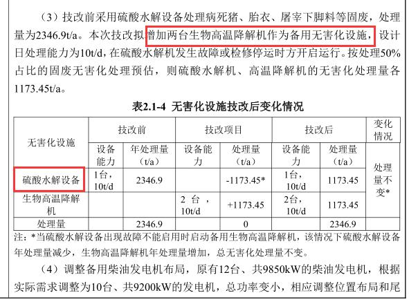 【猪屎味有望解决了?】南沙著名的立体养猪大楼迎来新动态!广州市生态环保局发布《南沙立体化全产业链生猪养殖配套工程技术改造项目环境影响报告表受理公告》,从公告可以看到,本次技术改造的主要内容为:为配合生产的需要,建设单位计划对生猪养殖项目的配套工程进行技术改造,具体包括以下建设内容:①将车间改造为饲料品管室、猪病检测室、肉品质控室和污水质检室4个检测室;②调整饲料配方,增加大豆油作为饲料加工车间原料添加至仔母猪饲料,年饲料加工量不变;③增加2台高温生物降解机作为无害化处理备用设备,年无害化处理量不变;④优化调整备用发电机布局与尾气排气筒高度。本次在现有厂房对生猪养殖项目的配套工程进行技改,不新增占地和建筑面积,本技改项目不影响生猪养殖主体工程的产能。 南沙立体化全产业链生猪养殖配套工程技术改造项目在现有厂房建筑内进行,不新增占地和建筑面积。建成4个质检室,增加大豆油作为饲料加工车间原料添加至仔母猪饲料,病死猪无害化设备增加生物高温降解机作为备用,调整备用发电机布局。项目总投资320万元,其中环保投资50万元。 可以其中新增了好几个废气处理设施,理论上应该是可以改善废气排放等问题的。 另外也可以看到这个项目对于死猪和边角料的处理方式,之前为硫酸水解的方式,而这次则新增了生物高温降解,具体工作模式可以看图片文字介绍。 另外还可以看到,本次技改还更改了排气口。 需要注意的是,本次技术改造之后,这个养猪大厂的规模并没有增加。