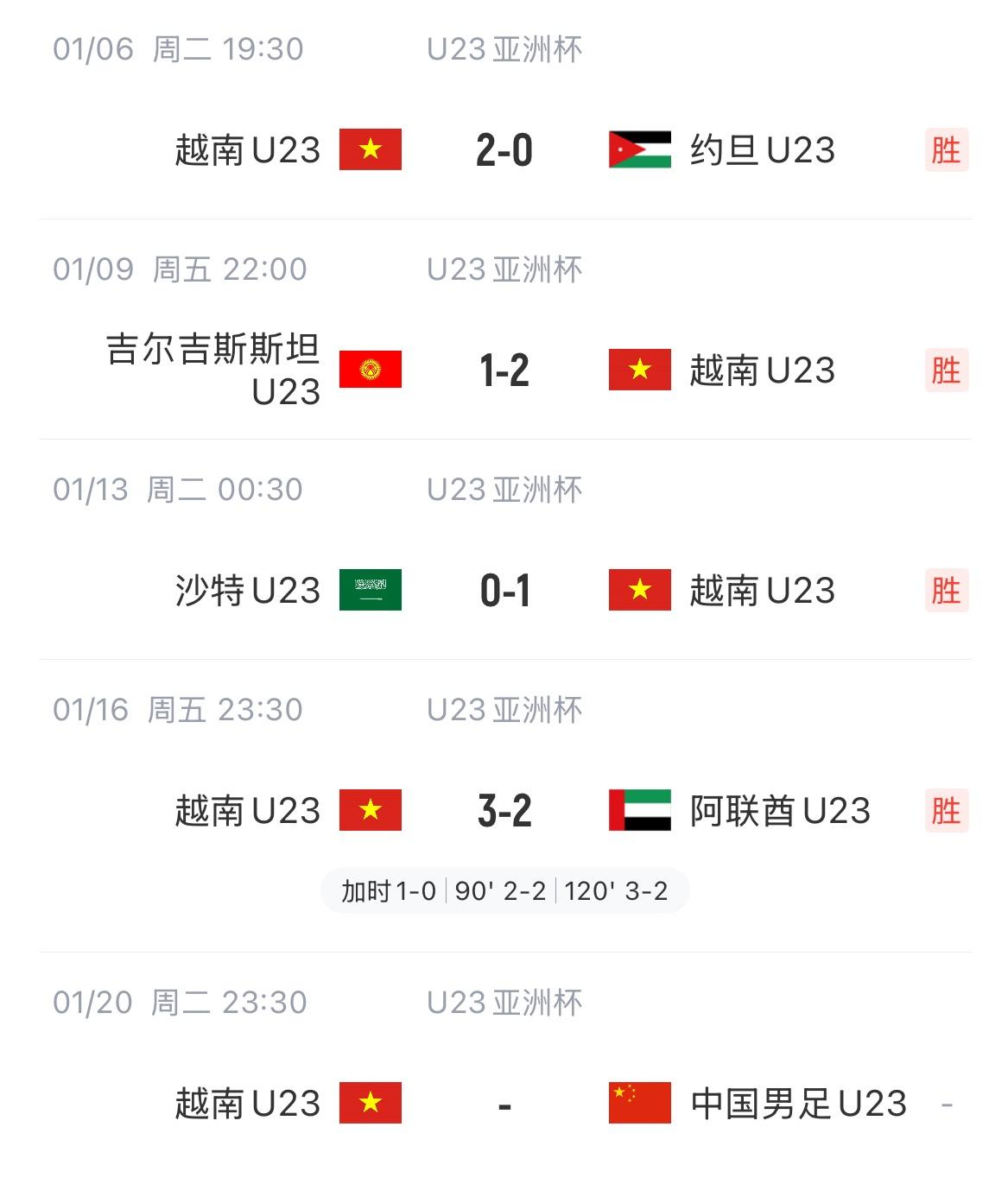 U23亚洲杯半决赛,国足—越南。越南方面非常乐观,原因是: 国足4场比赛仅打入1球,小组赛1胜2平,1/4决赛依靠点球晋级。 越南男足在4场比赛中打进8球,失3球。4场比赛全胜晋级。