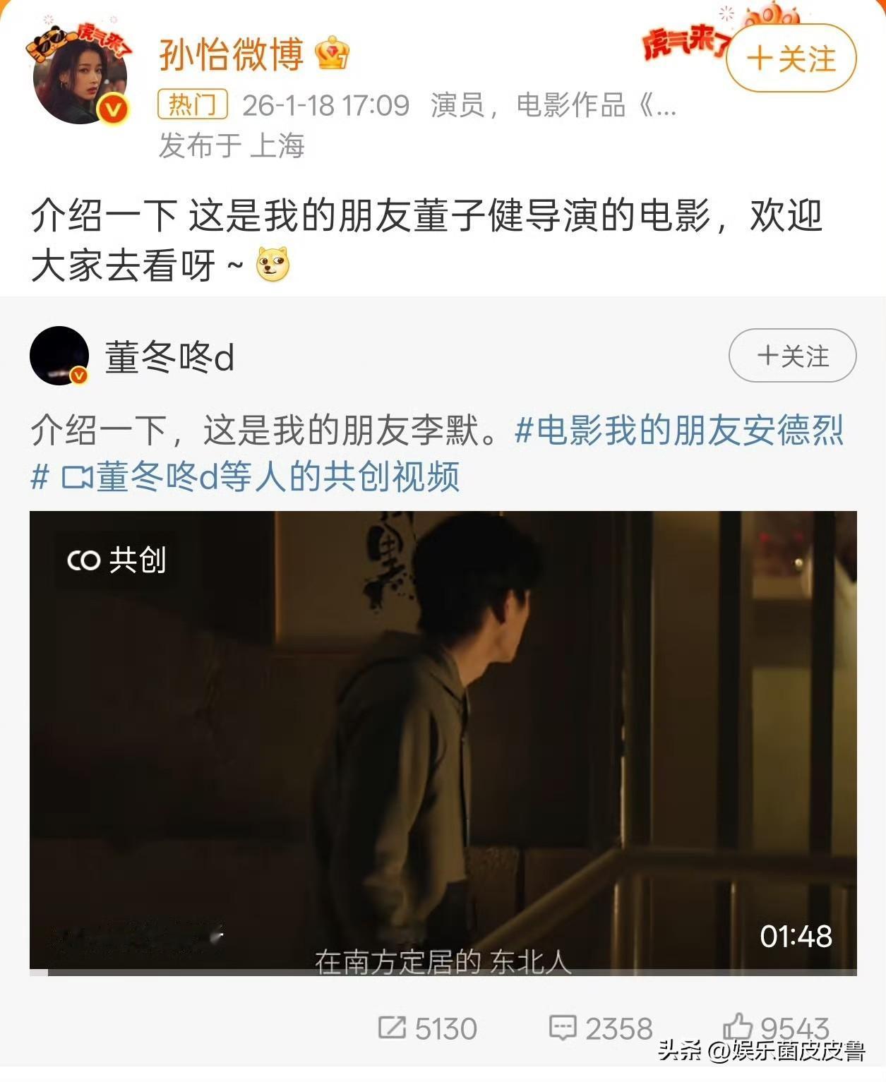 孙怡,发文了! 1月18日,孙怡发微博宣传董子健的电影《我的朋友安德烈》,“介绍一下,这是我的朋友董子健导演的电影,欢迎大家去看呀~[狗头]”。董子健在评论区回复称:谢谢你,我的朋友。这是俩人离婚后首次互动。 夫妻变朋友,没有撕扯,没有老死不相往来,没有绝不同台,这俩人也是娱乐圈离婚夫妻的清流了,当初的爱是真的,如今的不爱也是真的,好在俩人很体面。